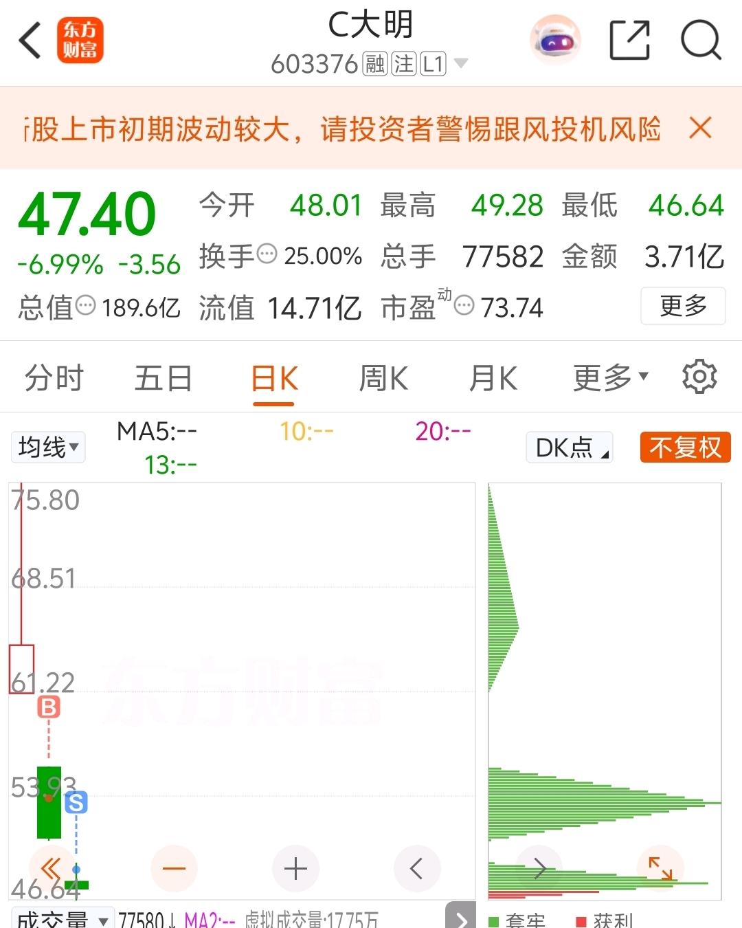 $C大明(SH603376)$ 不要幻想,53.89买,48.79今天亏四个多点割肉,虽然冲到49以上也不追。到47.47破了也不去抄底,看吧现在最低46开头,不要今天盘中富贵几个点,明天又跳空低开,别幻想了各位