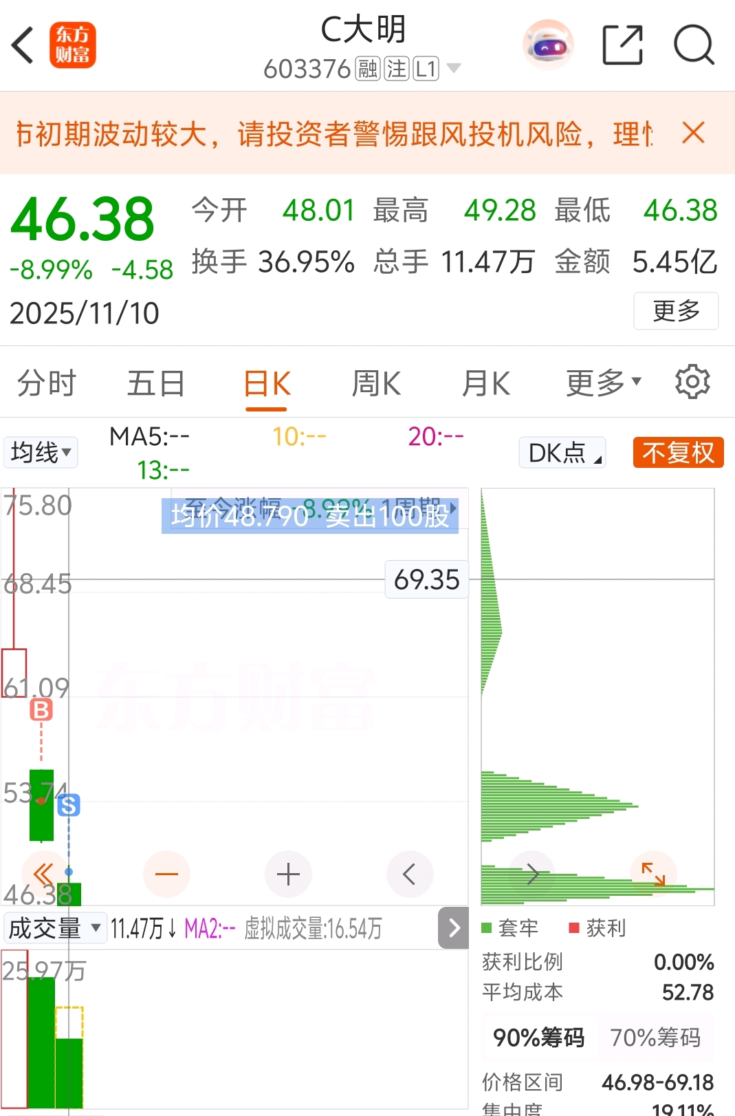 不要因为盘中赚一点美滋滋,明天就是别人抄底你到了,。我一手54买49卖都亏十个点,我要是幻想我亏15个