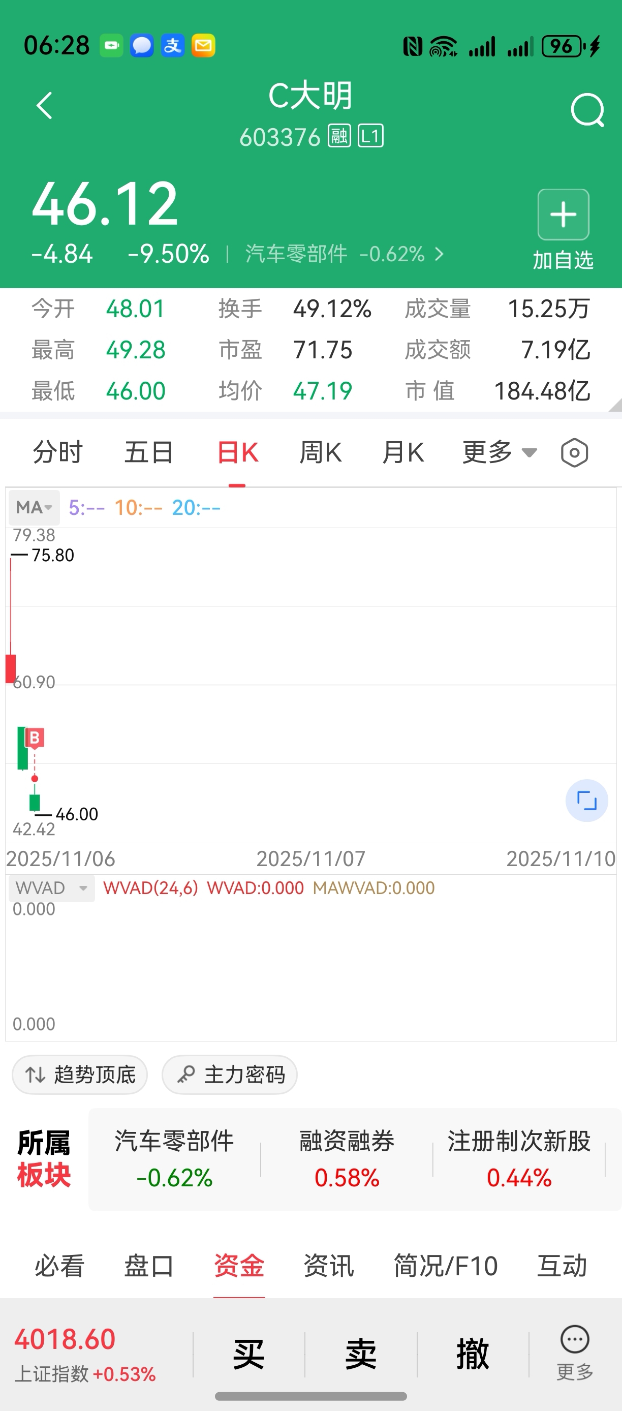 $C大明(SH603376)$ 德力佳吃了6个点过来的,这3天除了主力基本都是中签散户跟带血筹码,昨天46形成强支撑,果断买入,反弹是肯定反弹的,补一个缺口两个缺口的事,上市既腰斩庄家有大麻烦的,暴跌不会有的今天相对安全。