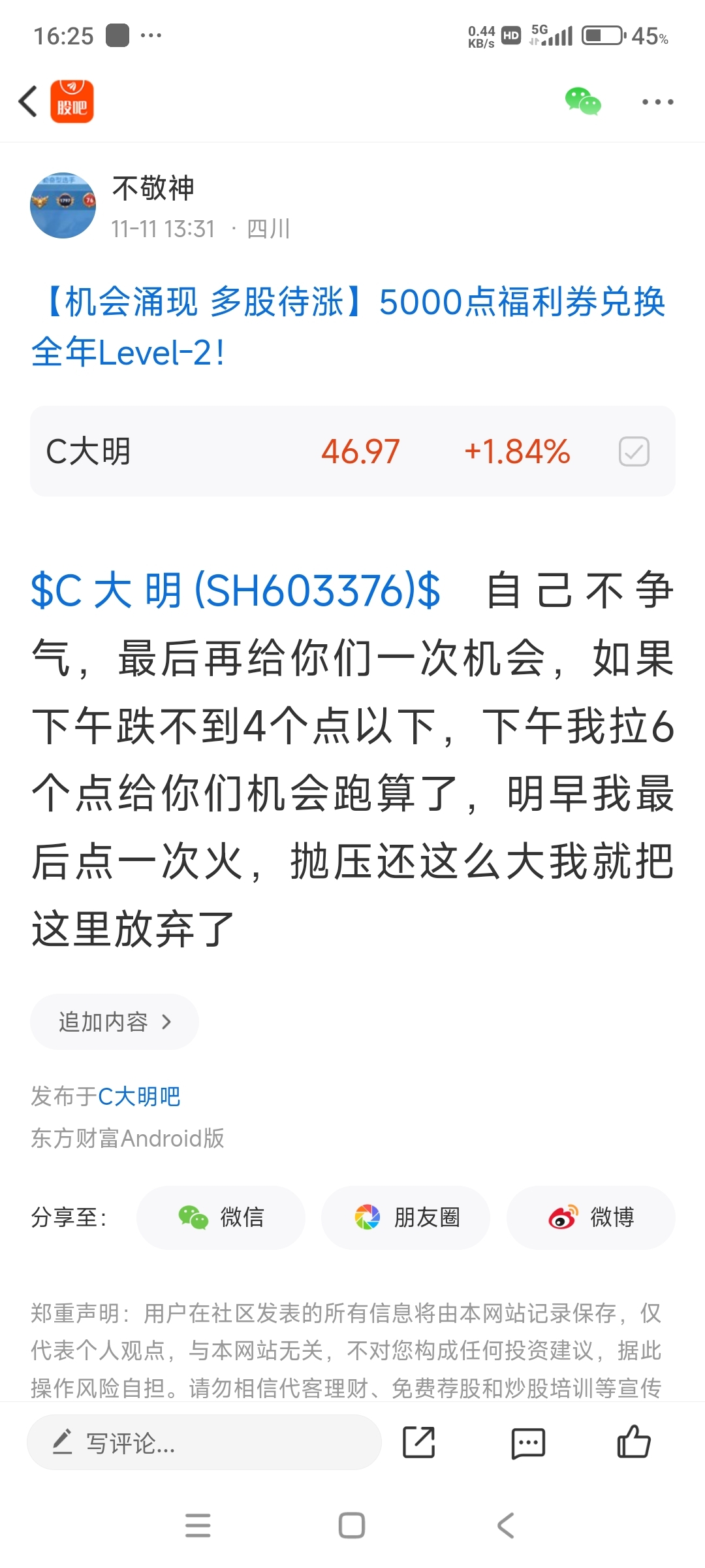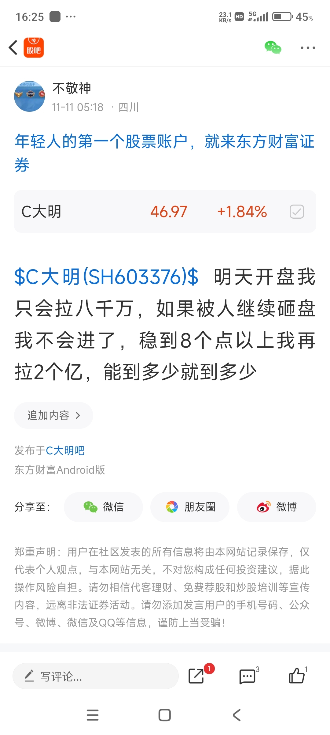 温馨提示: 1.根据《证券法》规定,禁止编造、传播虚假信息或者误导性信息,扰乱证券市场;2.用户在本社区发表的所有资料、言论等仅代表个人观点,与本网站立场无关,不对您构成任何投资建议。用户应基于自己的独立判断,自行决定证券投资并承担相应风险。《东方财富社区管理规定》