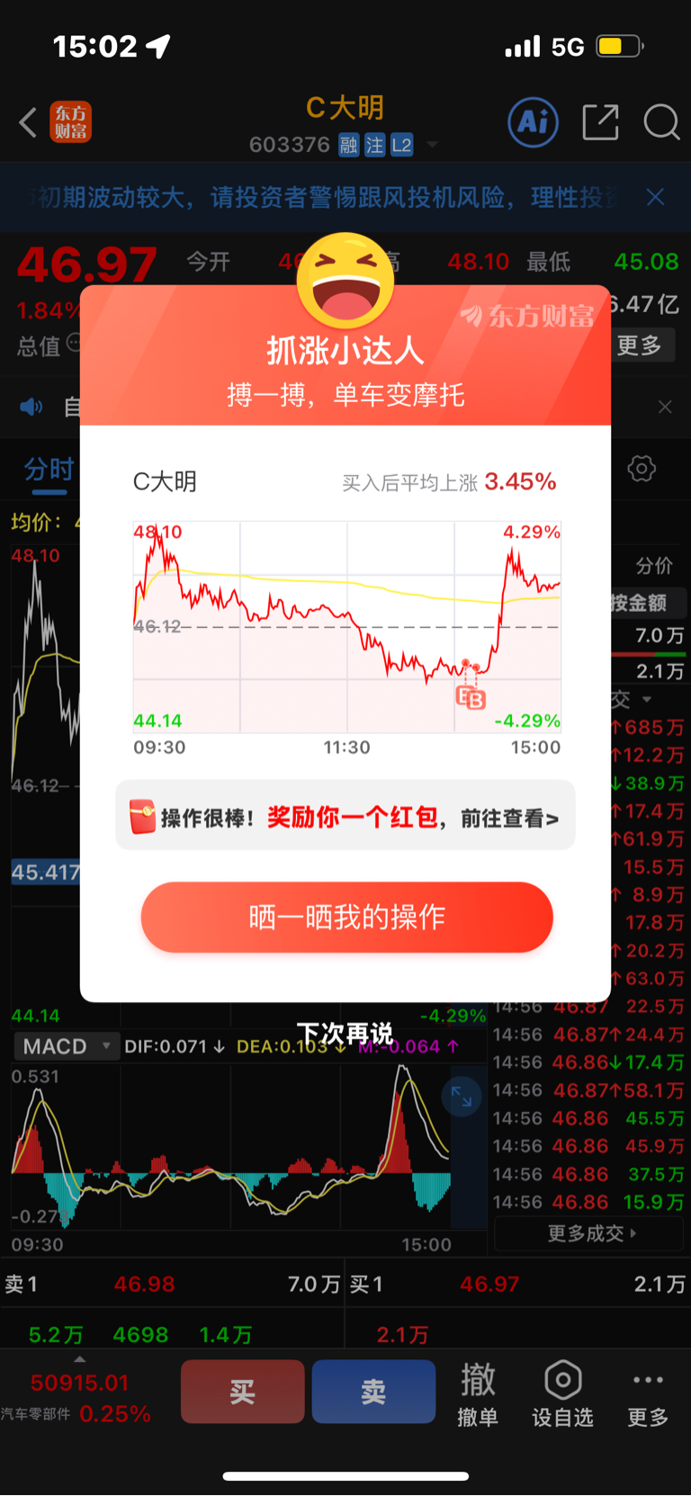 $C大明(SH603376)$ 不好意思了,各位曹了你们的老底,明天不多,赚点就走了