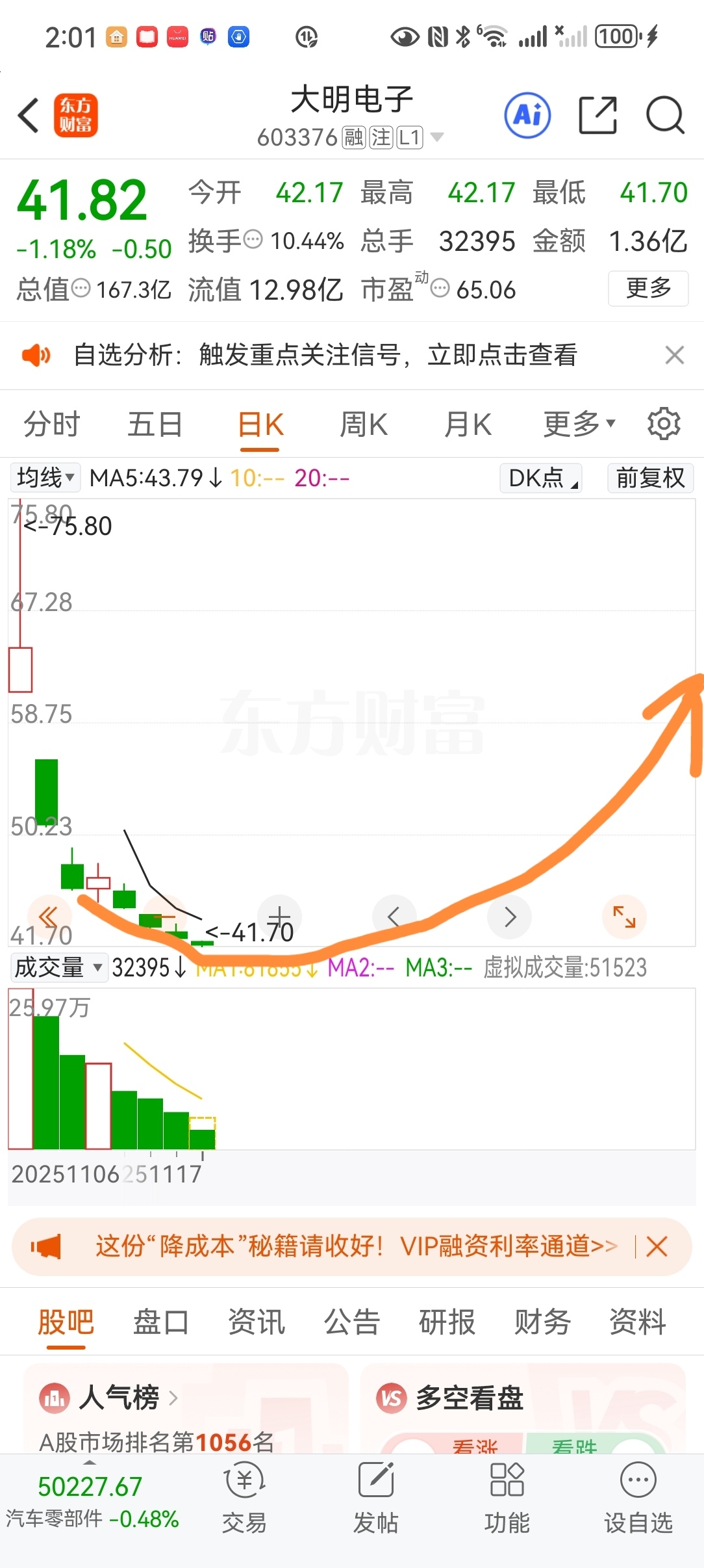 $大明电子(SH603376)$ 下午2:01分刚想提醒进第四仓,它就拉红了。就没发了,收盘发个图片见证