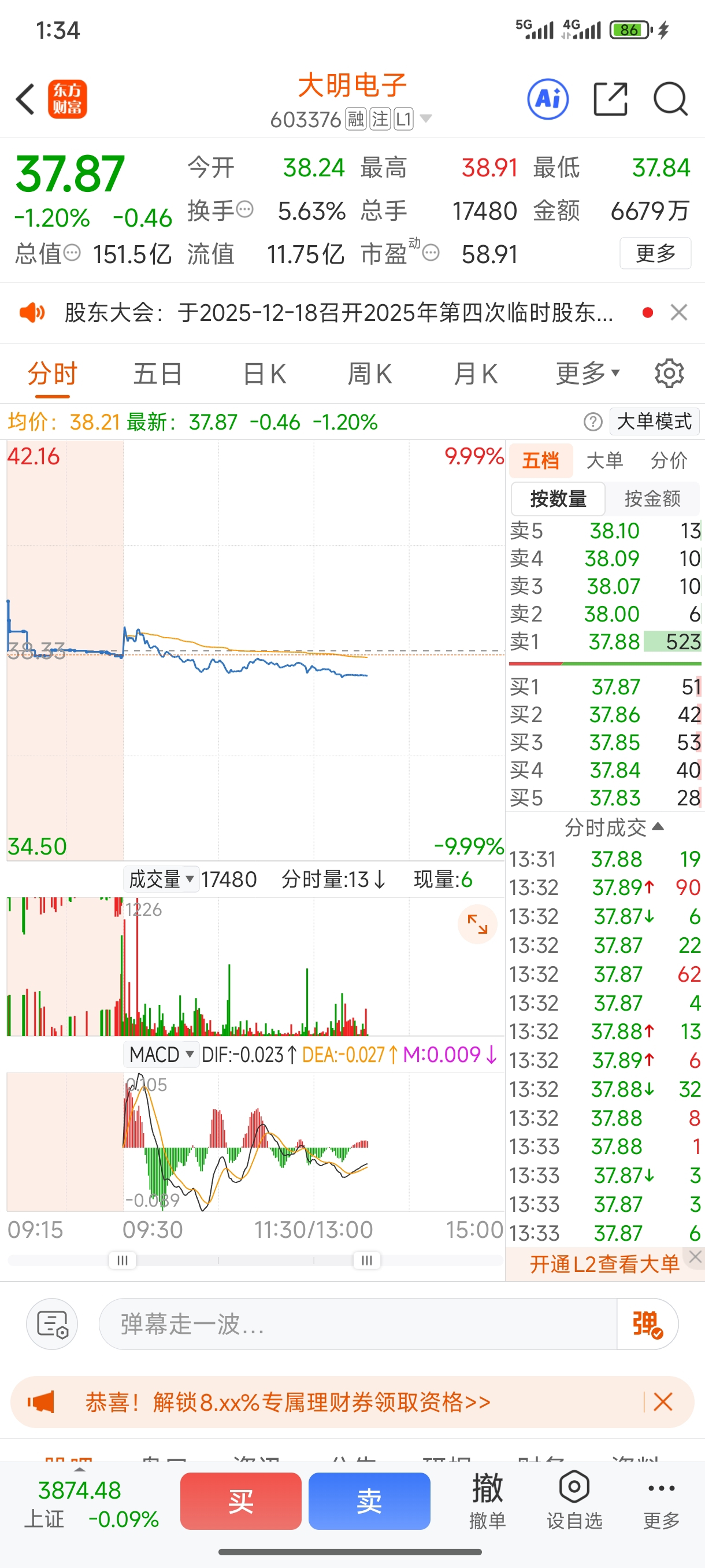 $大明电子(SH603376)$ 下午37.89和37.88挂37.89挂1000多少手卖单,正常情况下是加速下跌,但是它不跌,反而横盘,这个位置感觉要注意一下