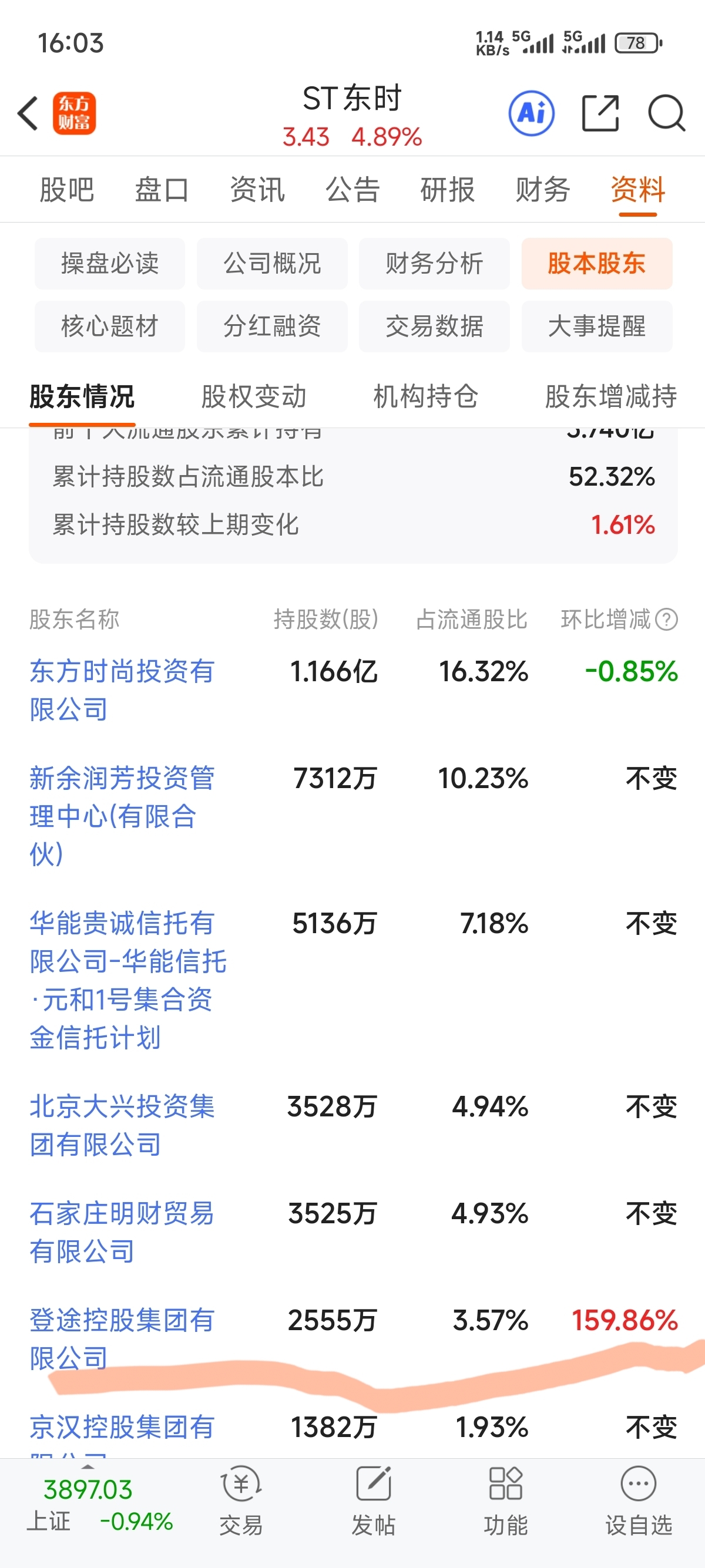 $ST东时(SH603377)$ 登途变成第二大股东了