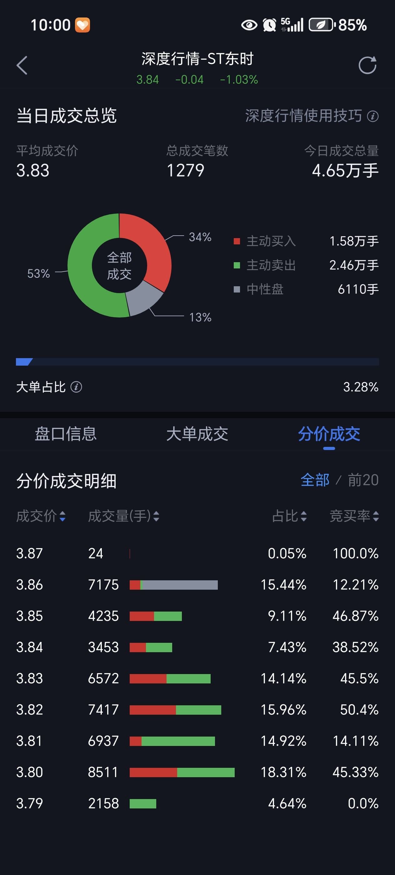 $ST东时(SH603377)$ 今天开盘半小时总结:老庄气急败坏跑量打压,小庄见势不对诱敌深入,至3.8左右小庄埋伏而老庄气短,目前小庄于3.83附近与老庄僵持