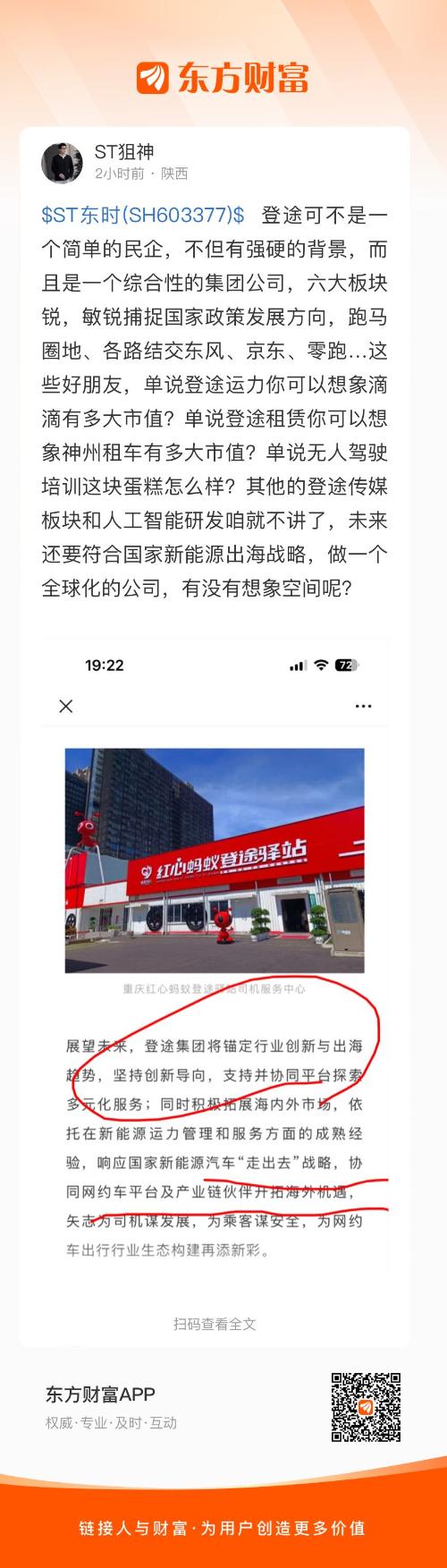 $ST东时(SH603377)$ 登途可不是一个简单的民企,不但有强硬的背景,而且是一个综合性的集团公司,六大板块锐,敏锐捕捉国家政策发展方向,跑马圈地、各路结交东风、京东、零跑…这些好朋友,单说登途运力你可以想象滴滴有多大市值?单说登途租赁你可以想象神州租车有多大市值?单说无人驾驶培训这块蛋糕怎么样?其他的登途传媒板块和人工智能研发咱就不讲了,未来还要符合国家新能源出海战略,做一个全球化的公司,有没有想象空间呢?