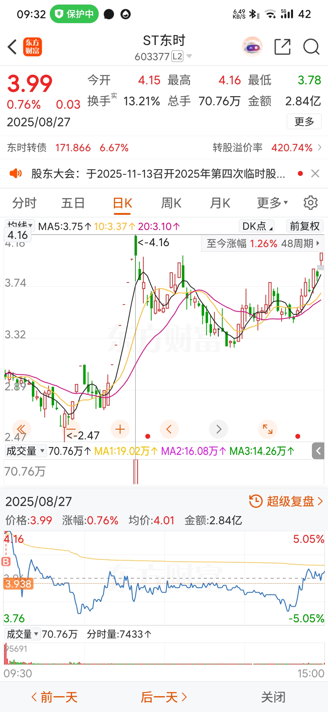 $ST东时(SH603377)$ 说出来你们不行,我8.27最高点买的