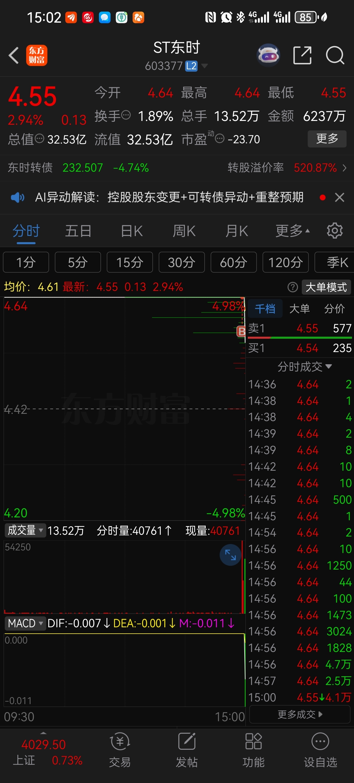 $ST东时(SH603377)$ 终于进来了,谢谢主力全家