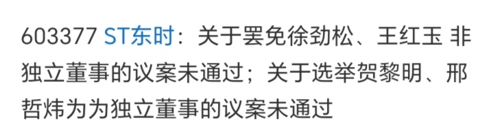 $ST东时(SH603377)$ 现在已经把老徐带来的退市风险都给消除干净了,这几个新的股东开始内斗争实控权,很明显的就是你不服我,我不服你。就看转债,到时候怎么解决了。如果这几个股东还在内斗的话,解决不了转债的话,或者说开始躺了,不出力了,那么东时还是很危险的