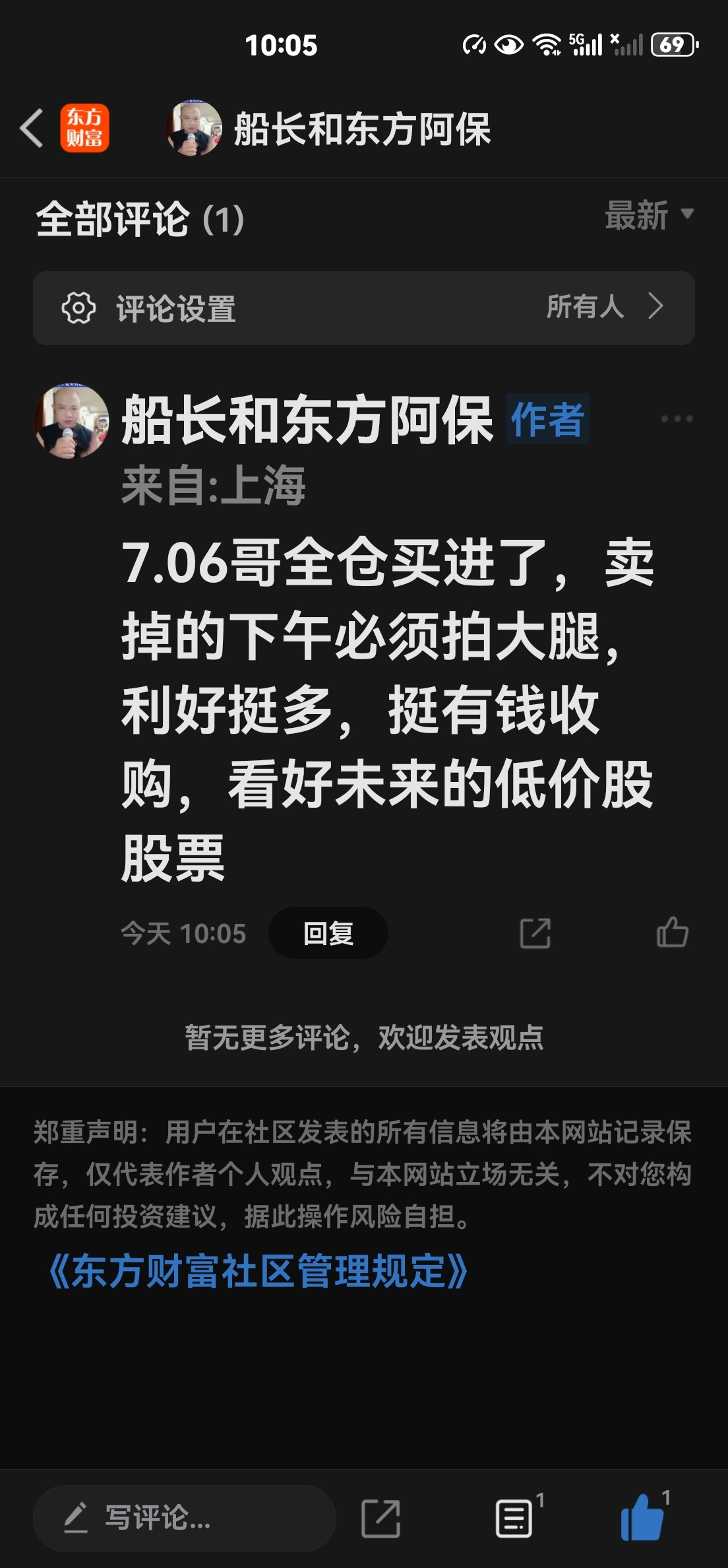 温馨提示: 1.根据《证券法》规定,禁止编造、传播虚假信息或者误导性信息,扰乱证券市场;2.用户在本社区发表的所有资料、言论等仅代表个人观点,与本网站立场无关,不对您构成任何投资建议。用户应基于自己的独立判断,自行决定证券投资并承担相应风险。《东方财富社区管理规定》