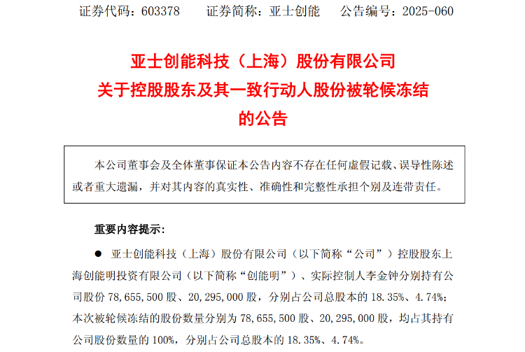 根据公告,亚士创能控股股东创能明、实际控制人李金钟分别持有公司股份78,655,500股、20,295,000股,分别占公司总股本的18.35%、4.74%。本次被轮候冻结的股份数量均占其持有公司股份数量的100%。