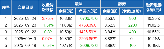 三美股份:融资净偿还6706.75万元,融资余额10.33亿元(09-24)