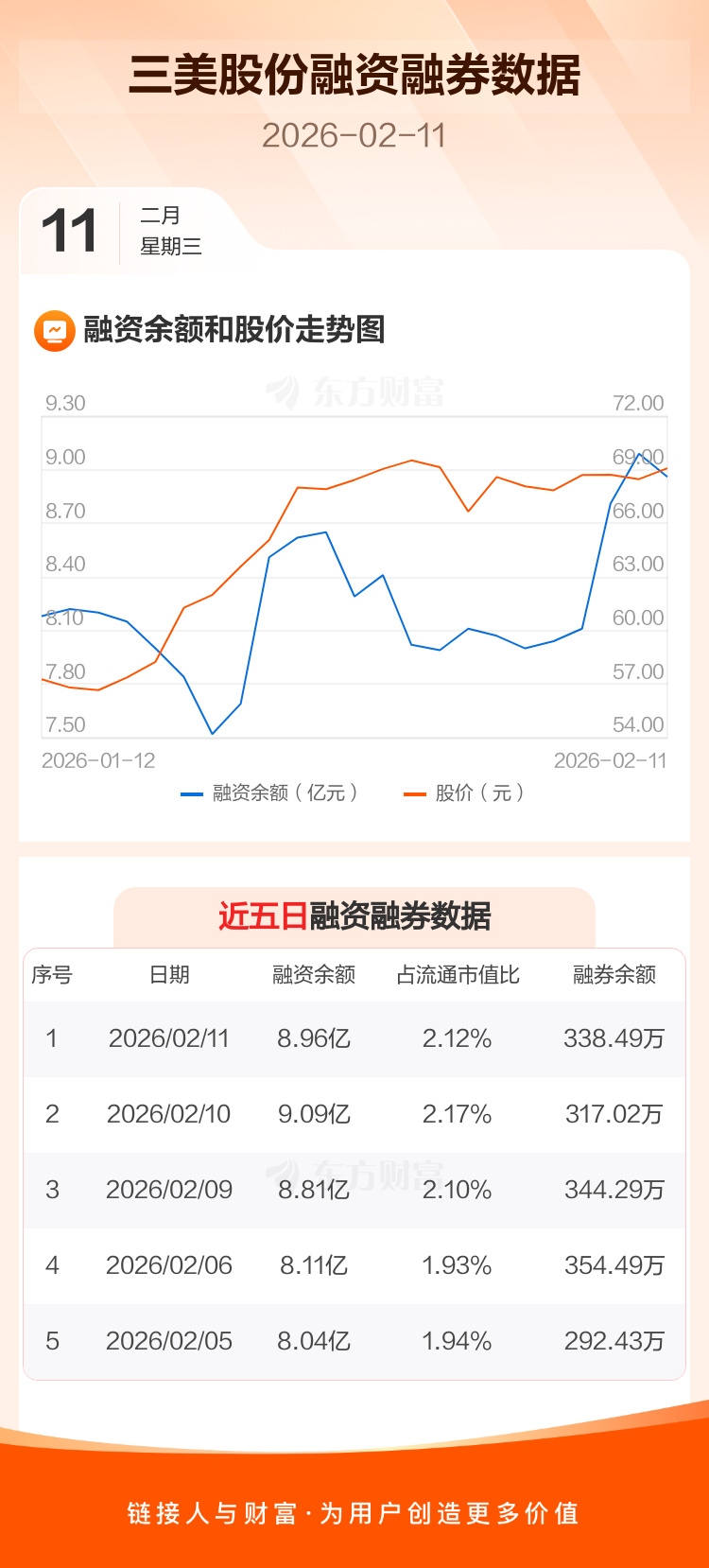 交易所最新数据显示,三美股份于2026年2月11日获融资买入4526.82万元,融资偿还5828.20万元,当日融资净偿还1301.38万元。目前,该股融资余额8.96亿,占流通市值比例为2.12%。