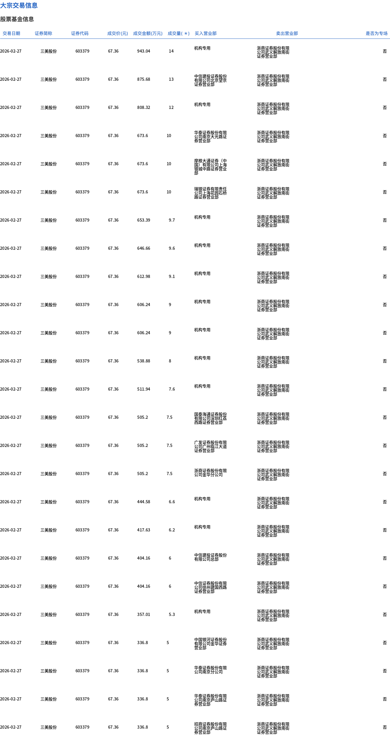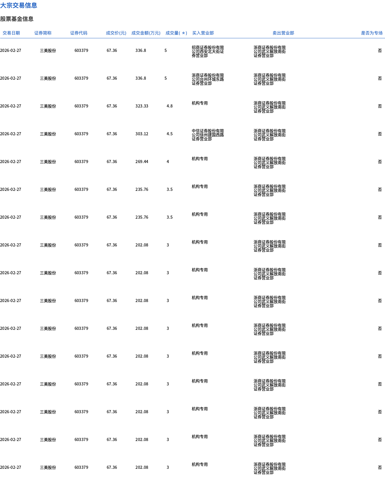 三美股份今日大宗交易折价成交459.5万股,成交额3.1亿元