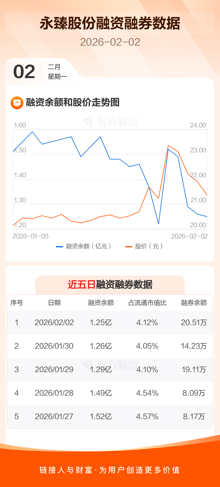 交易所最新数据显示,永臻股份于2026年2月2日获融资买入1366.45万元,融资偿还1466.17万元,当日融资净偿还99.72万元。目前,该股融资余额1.25亿,占流通市值比例为4.12%。