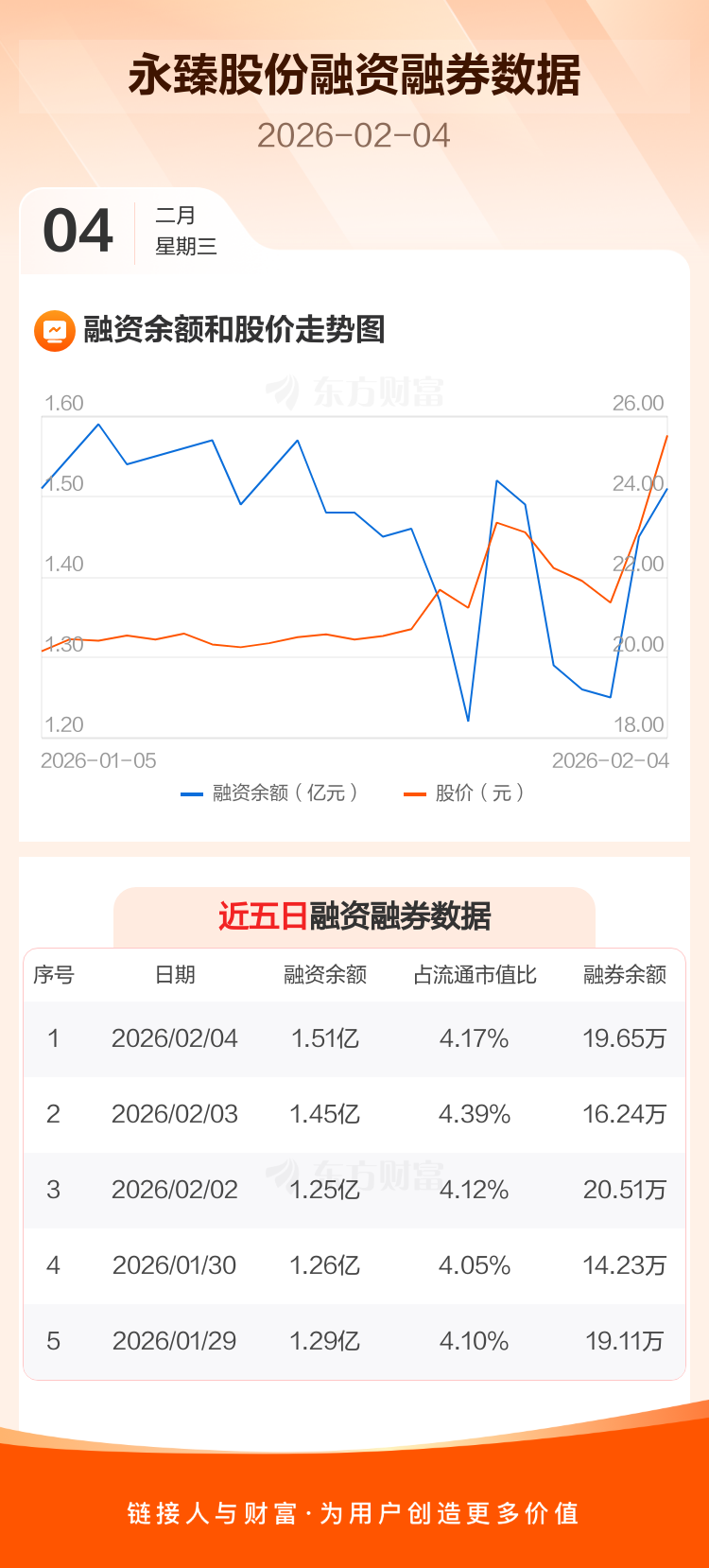 交易所最新数据显示,永臻股份于2026年2月4日获融资买入8357.38万元,融资偿还7696.60万元,当日融资净买入660.78万元。目前,该股融资余额1.51亿,占流通市值比例为4.17%。
