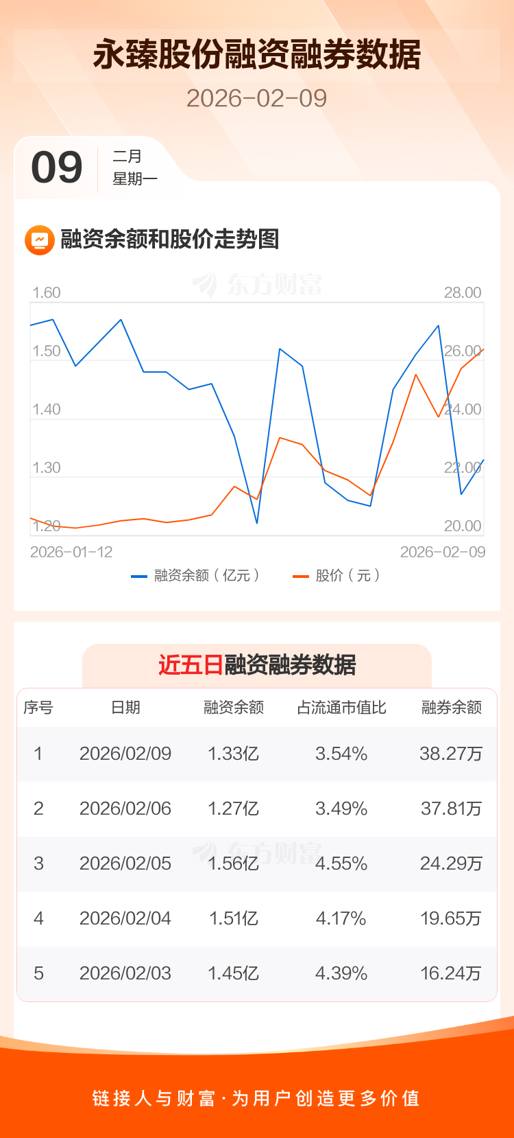 交易所最新数据显示,永臻股份于2026年2月9日获融资买入5753.77万元,融资偿还5230.28万元,当日融资净买入523.48万元。目前,该股融资余额1.33亿,占流通市值比例为3.54%。