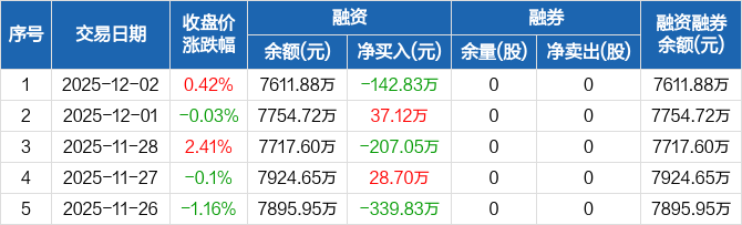 海阳科技:融资净偿还142.83万元,融资余额7611.88万元(12-02)