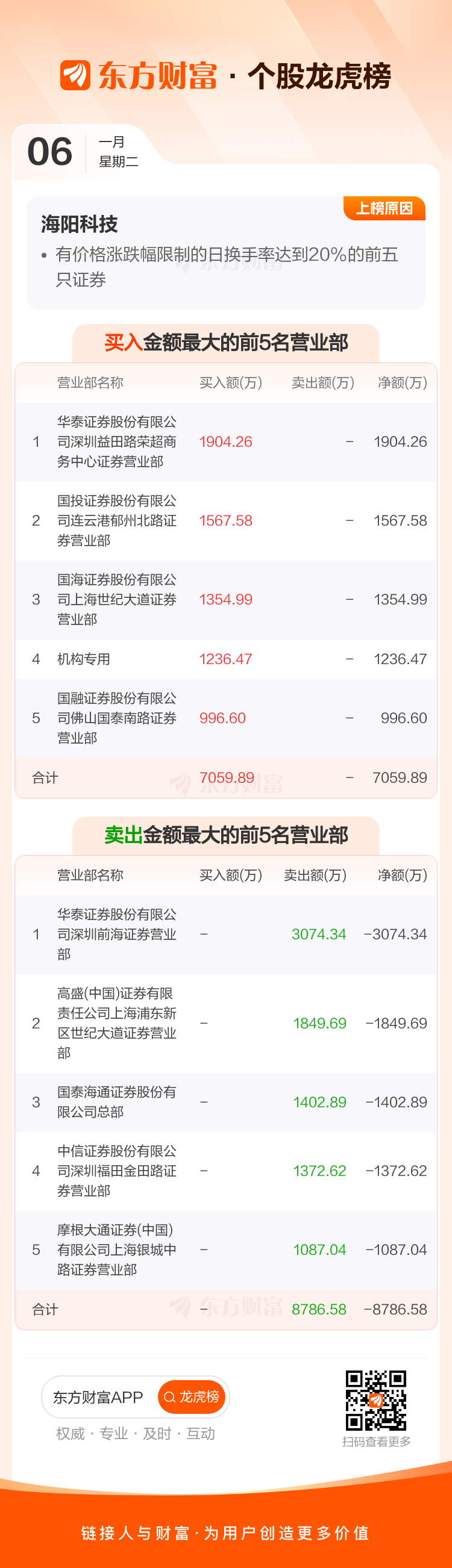 交易所2026年1月6日公布的交易公开信息显示,海阳科技因成为有价格涨跌幅限制的日换手率达到20%的前五只证券上榜。海阳科技当日收报34.43元,涨跌幅-2.16%,偏离值35.62%,换手率35.62%,成交额4.65亿。