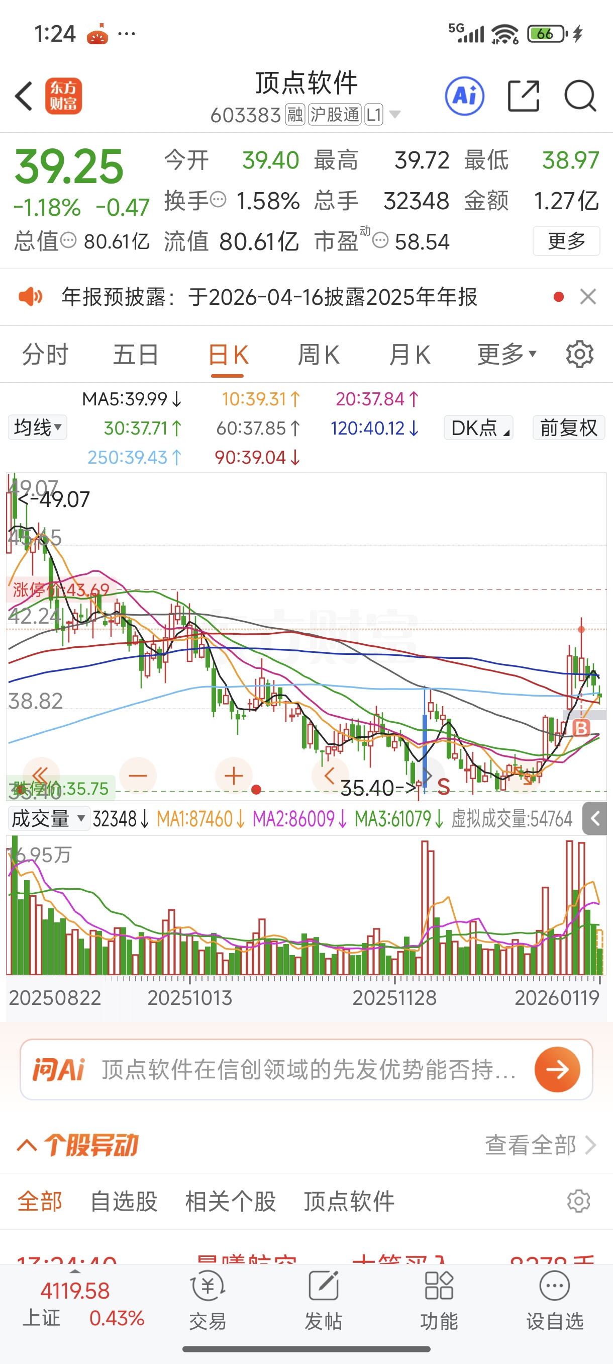 $顶点软件(SH603383)$ 不出意外是我害了大家,从我买进去就没红过