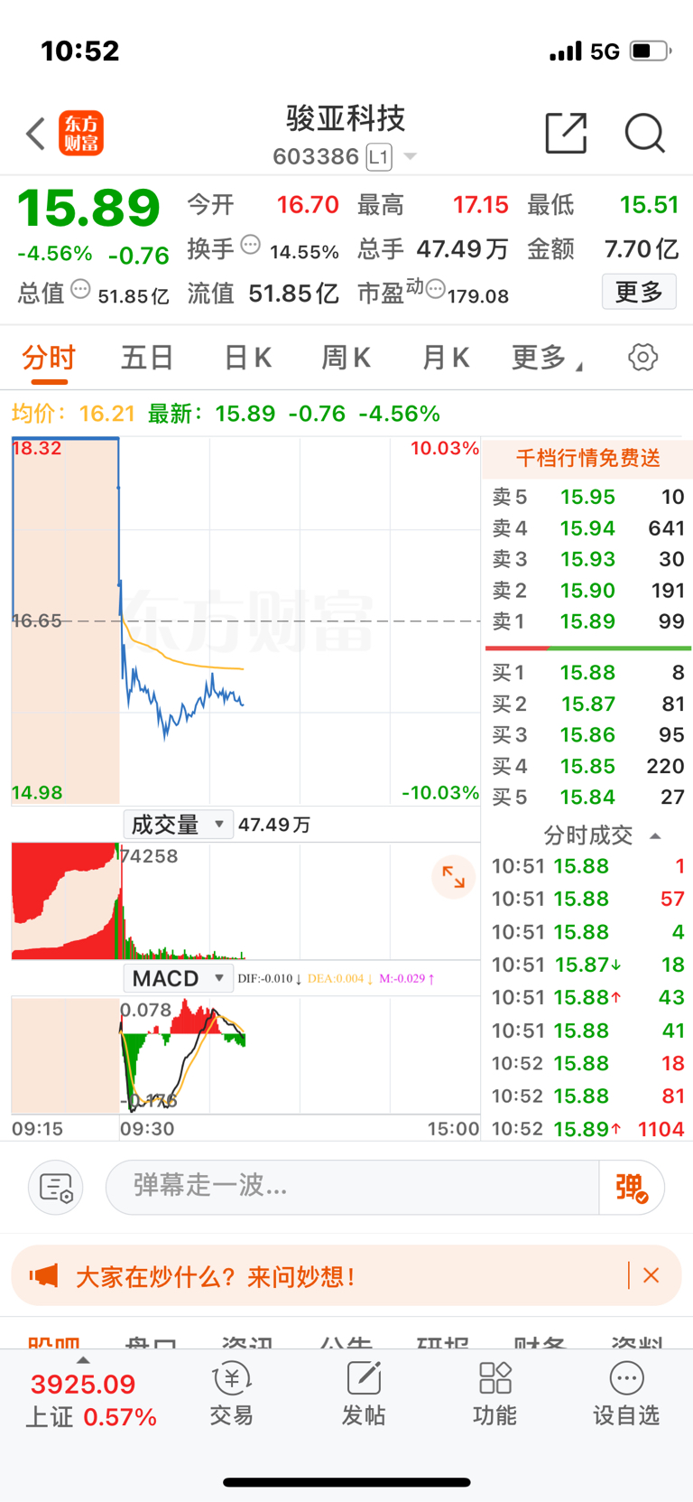 $骏亚科技(SH603386)$ 完美一天,十五个点到手,明天地板开盘还能赚钱