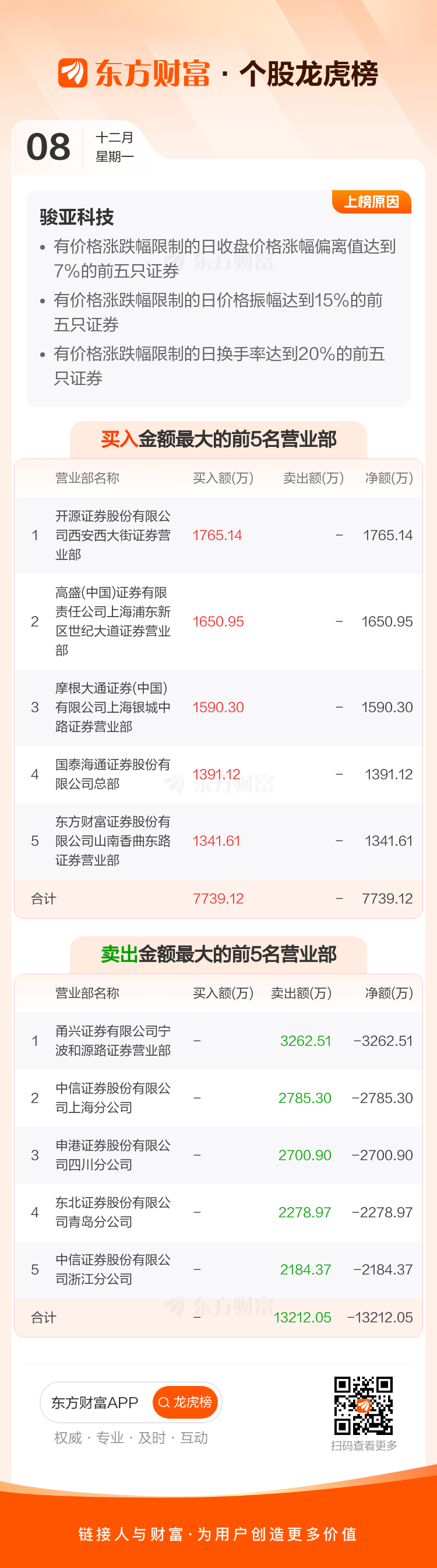交易所2025年12月8日公布的交易公开信息显示,骏亚科技因成为有价格涨跌幅限制的日收盘价格涨幅偏离值达到7%的前五只证券、有价格涨跌幅限制的日价格振幅达到15%的前五只证券、有价格涨跌幅限制的日换手率达到20%的前五只证券上榜。骏亚科技当日收报18.32元,涨跌幅10.03%,偏离值9.48%,换手率26.53%,成交额14.15亿。
