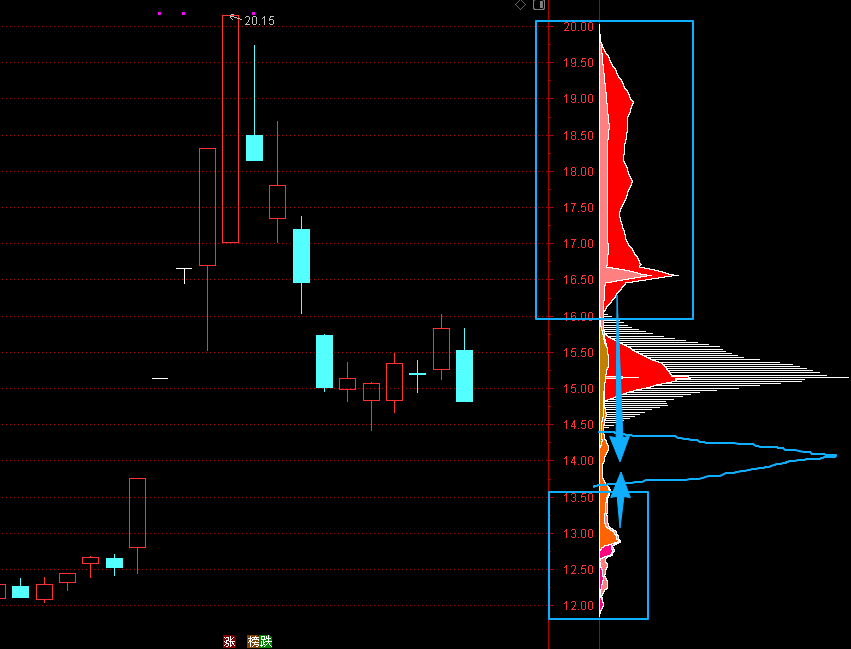 上方套牢筹码下移,下方获利筹码上移,形成新的筹码峰,在14元上下震荡筑底