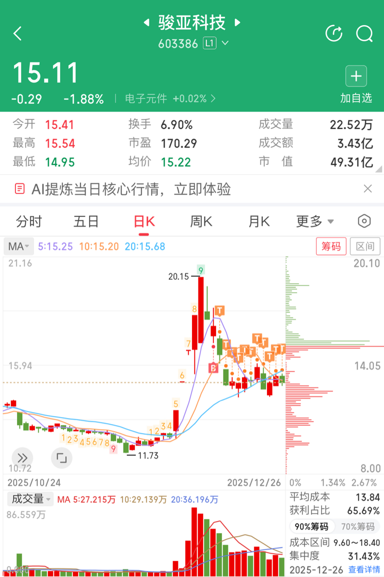 $骏亚科技(SH603386)$ 周五收盘了首先祝大家有个好的周末 三点:1、骏亚盘中没有跟福龙马走,那抛除它现在走马年属性。 2、也没跟优必选的锋龙走,或许这里也存在马卡龙的玄学,开个玩笑。 3、个人今天操作还是水下做T原则,确实人气也说明一切,风偏低的等20日线上方再回来吧,现在外面商业航天和电池都很强势。