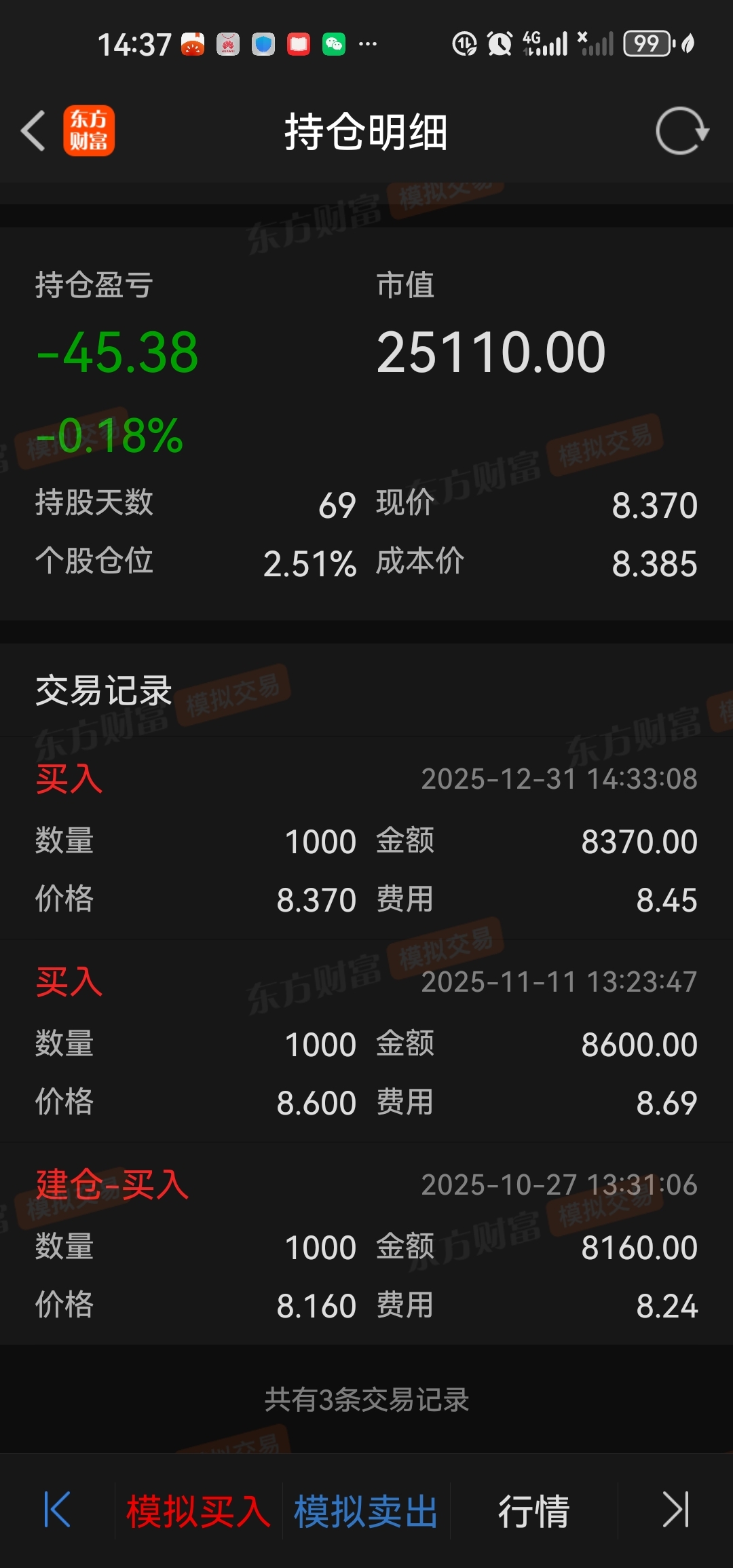 2025年12月31日,收盘前为留一点纪念,模拟资金加仓1000股。低价挂单未成