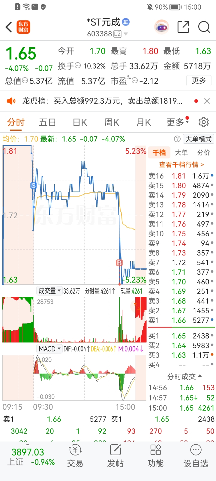 $*ST元成(SH603388)$ 明天亏五个点,放我出去!