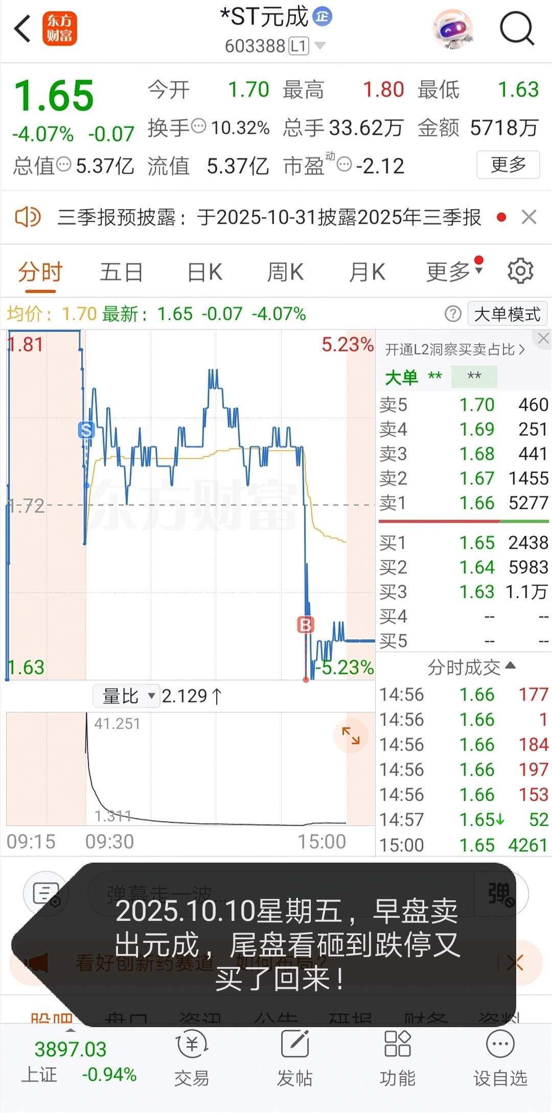 今天卖出元成了,留了100股时刻提醒自己!