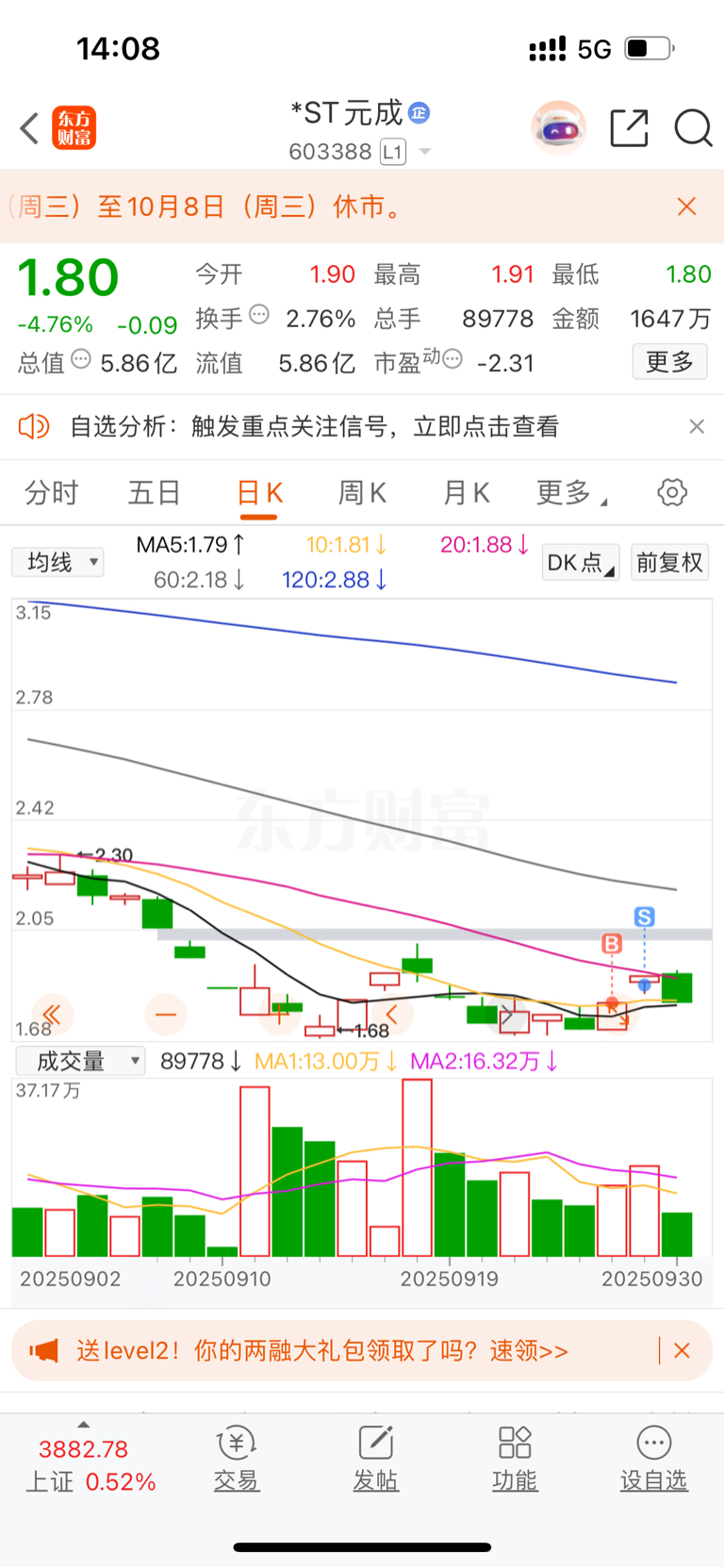 $*ST元成(SH603388)$ 我还赚了八个点回来看看大家
