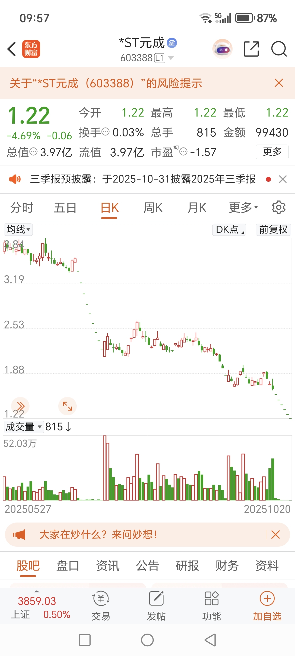 $*ST元成(SH603388)$ $上证指数(SH000001)$ 我朋友今天想买入赌个地天板,我要不要劝住他?