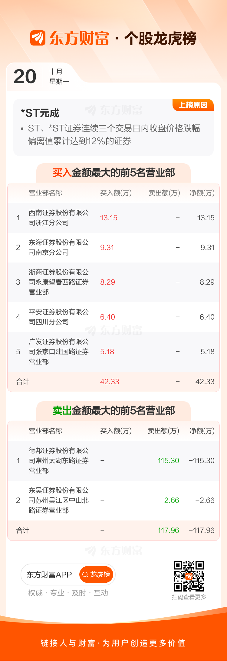 交易所2025年10月20日公布的交易公开信息显示,*ST元成因成为ST、*ST证券连续三个交易日内收盘价格跌幅偏离值累计达到12%的证券上榜。*ST元成当日收报1.22元,涨跌幅-4.69%,换手率0.07%,成交额27.82万。异常期间10月16日至10月20日,期间涨幅-14.08%,累计偏离值-12.85%,区间成交额117.96万。
