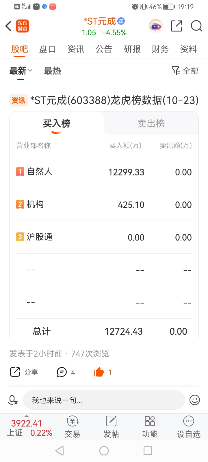 $*ST元成(SH603388)$ 这龙虎榜就算是三日榜也不对吧?买入榜第一个席位买了12299.33万元???每天成交量才几十万?