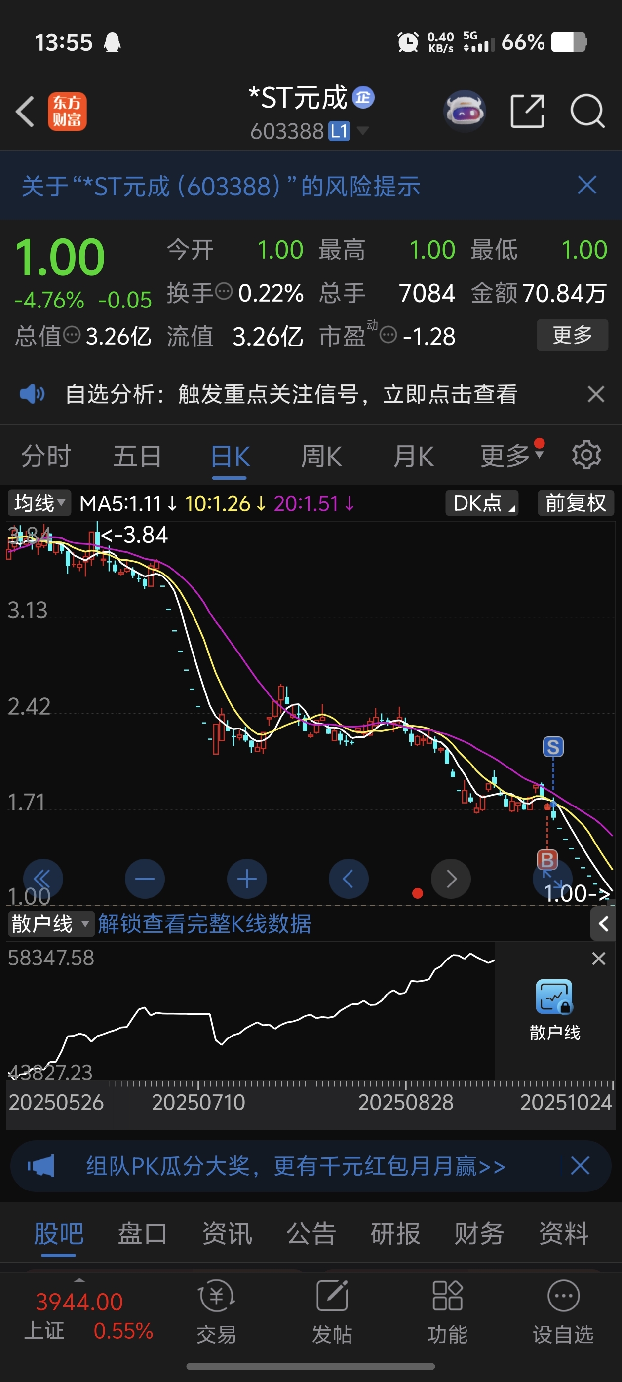 $*ST元成(SH603388)$ 鬼门关掺了一脚,太吓人了挣了一百块