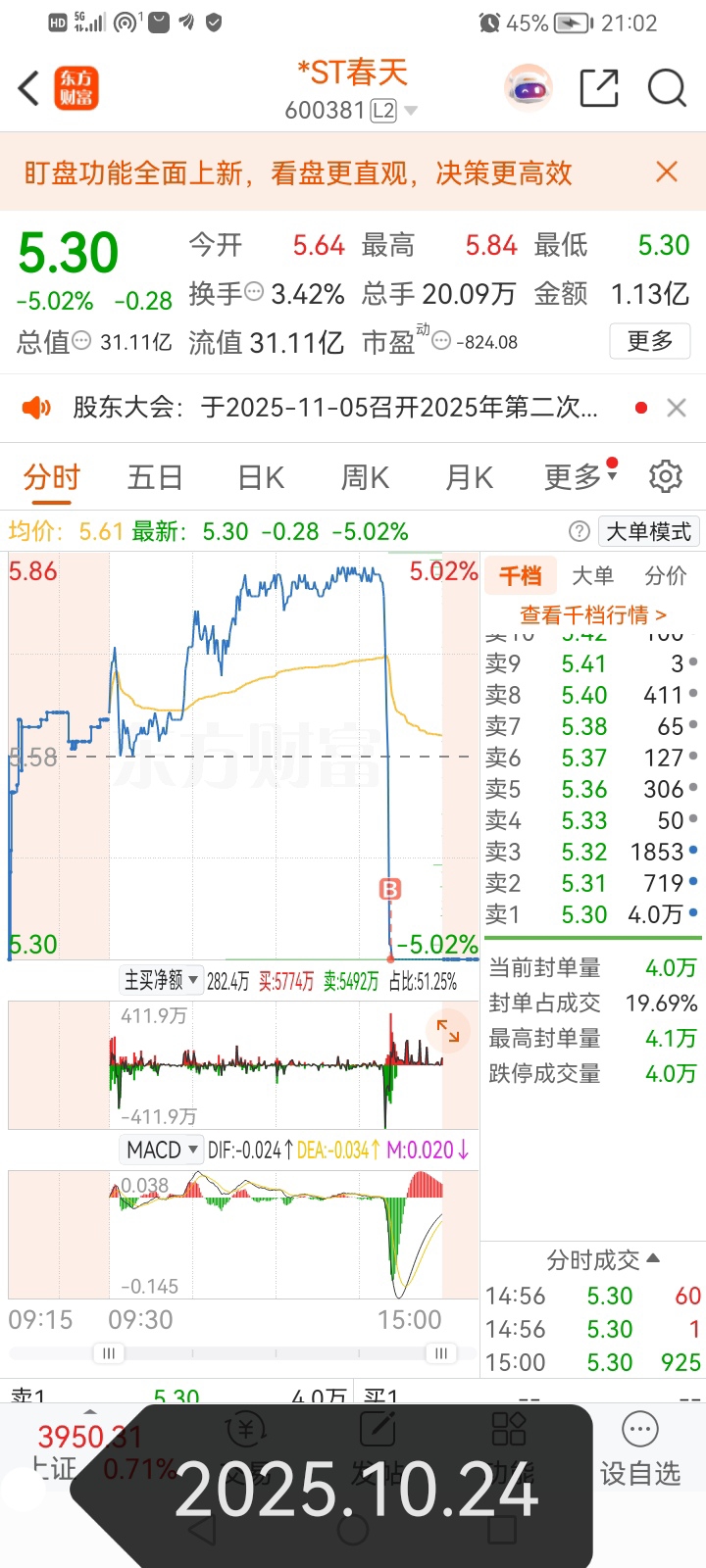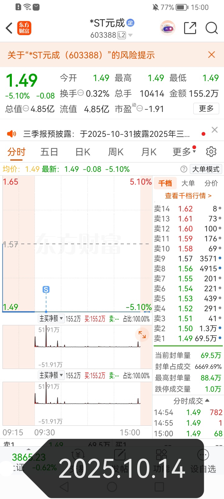 $*ST元成(SH603388)$ $*ST春天(SH600381)$ 元成和春天的飞刀我都接过,买了元成挂隔夜单好不容易跑了出去又买了春天,庄家砸到地板上不买怕撬板错过了地天板,结果每次买了都吃面!