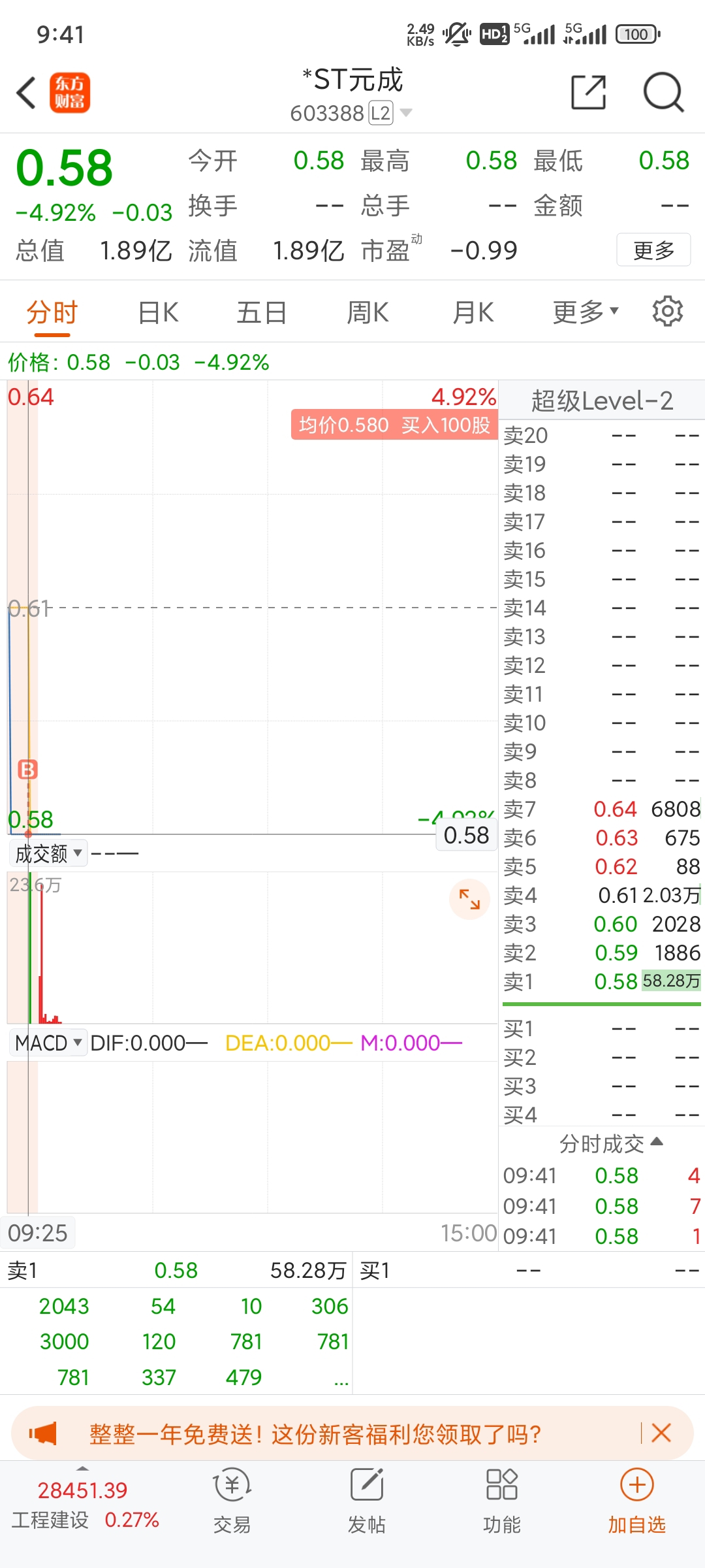 牛哥为*ST元成回购100股做门票钱,坐等进三板,四五分钱大量购买。
