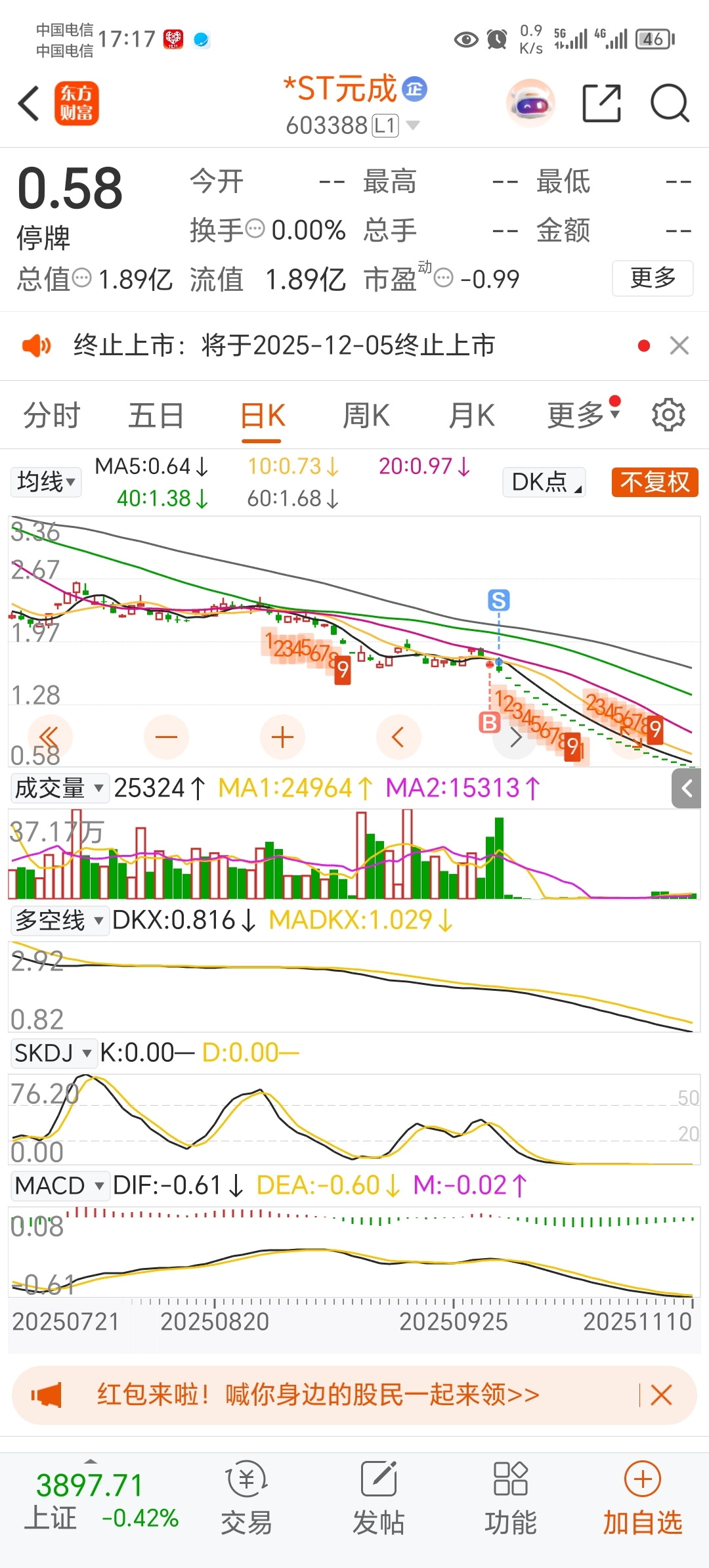 $*ST元成(SH603388)$ 太危险了,当天晚几分钟就跑不了,以后在也不敢碰ST股票了