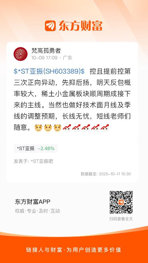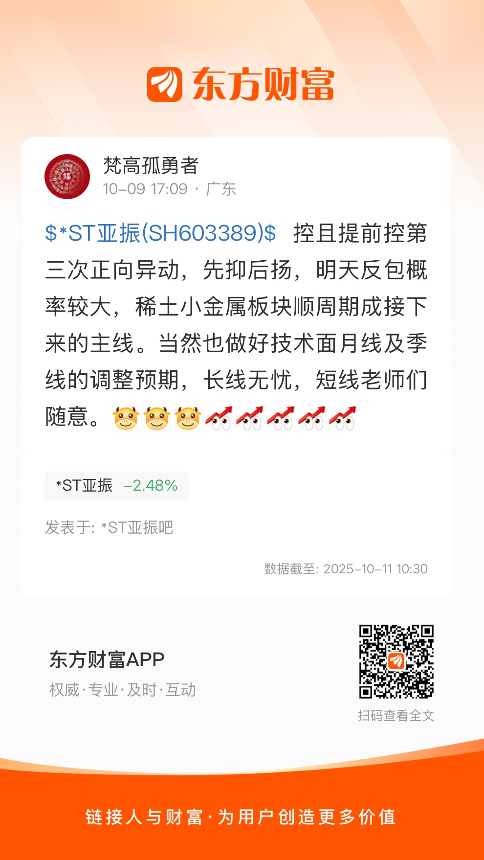$*ST亚振(SH603389)$ 控且提前控第三次正向异动,先抑后扬,明天反包概率较大,稀土小金属板块顺周期成接下来的主线。当然也做好技术面月线及季线的调整预期,长线无忧,短线老师们随意。