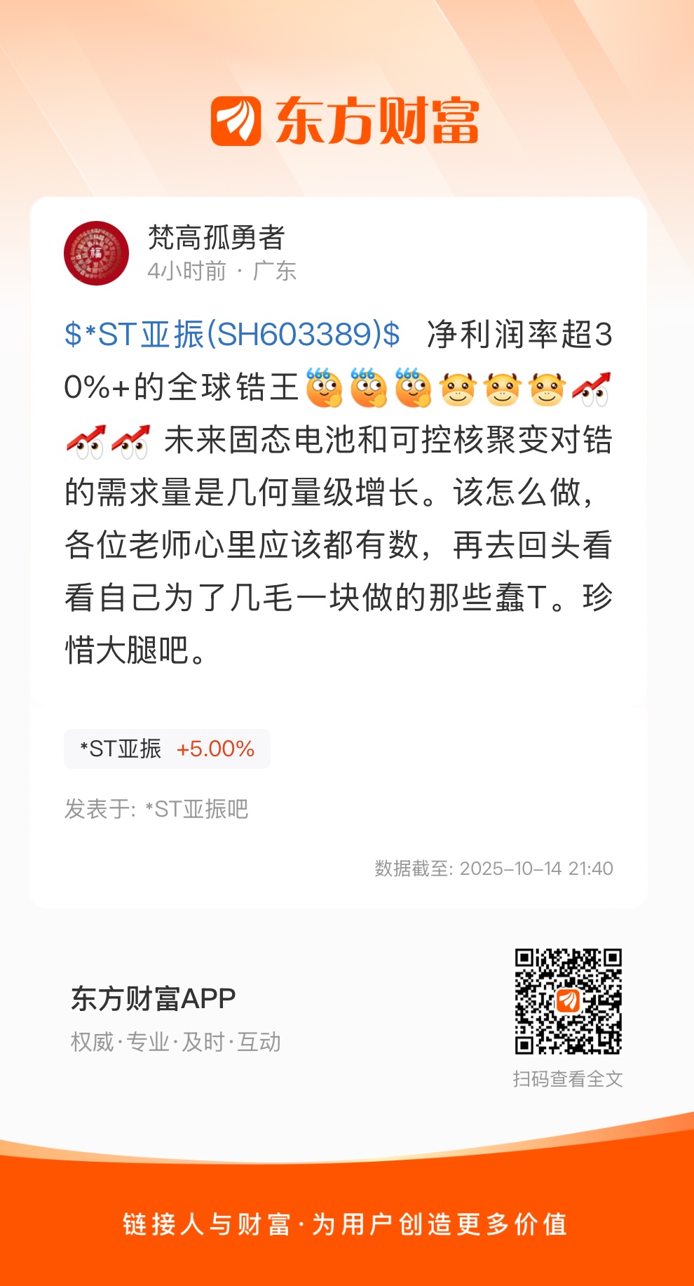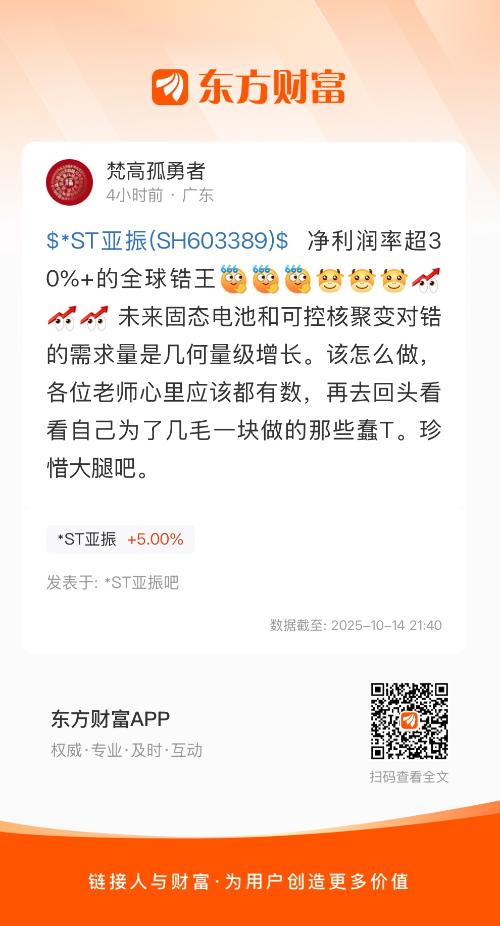 $*ST亚振(SH603389)$ 净利润率超30%+的全球锆王 未来固态电池和可控核聚变对锆的需求量是几何量级增长。该怎么做,各位老师心里应该都有数,再去回头看看自己为了几毛一块做的那些蠢T。珍惜大腿吧。