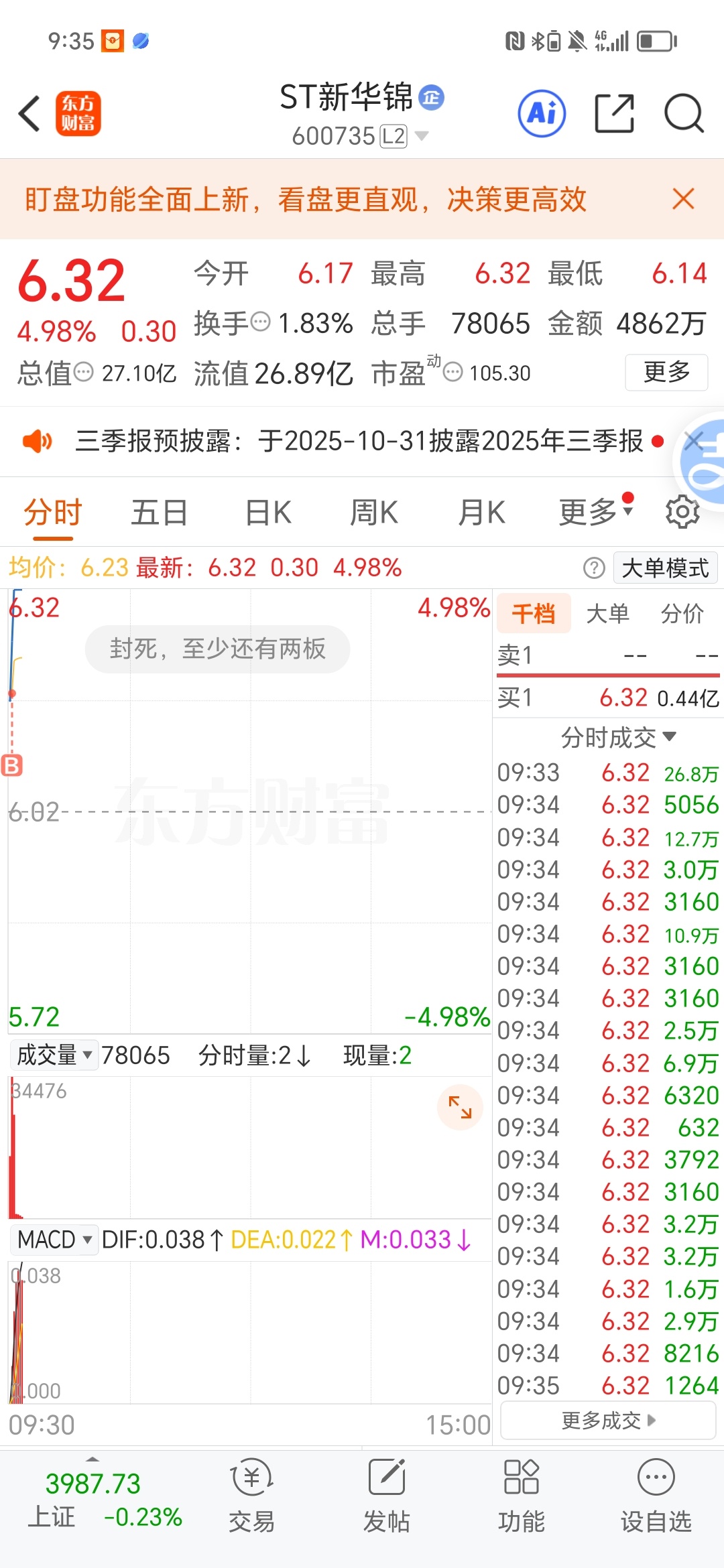 $*ST亚振(SH603389)$ $*ST亚太(SZ000691)$ $*ST宇顺(SZ002289)$ 10.17自身操作:亚振昨晚出了提示公告,今天跌停开,有点想不到,昨晚觉得有影响,但没有想到跌停开,觉得上涨趋势不会一下子反转,所以没有挂隔夜单,为自己认知买单,今天大盘不好,板块做多情绪很差,高标股正平和东易砸板。亚振今天开盘才挂单就卖不出去了。亚太,宇顺和亚振走势相互影响的,看看他们有没有利好公告,走强带动下亚振。