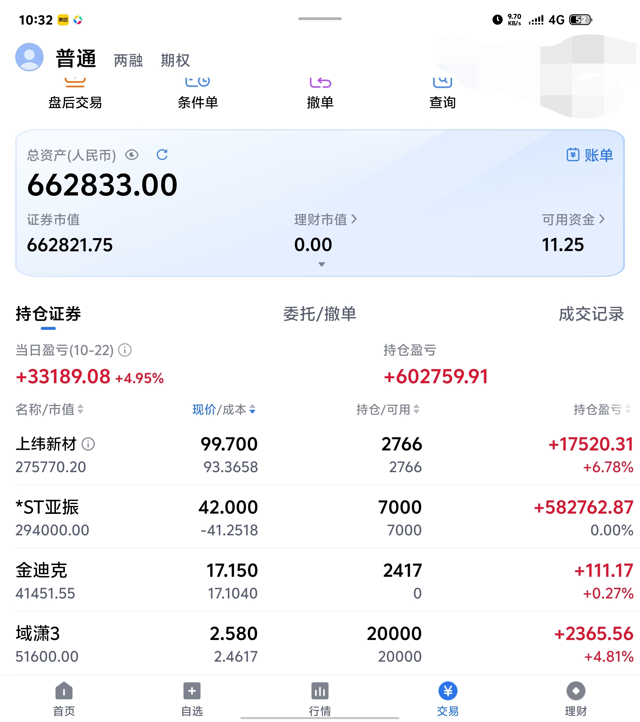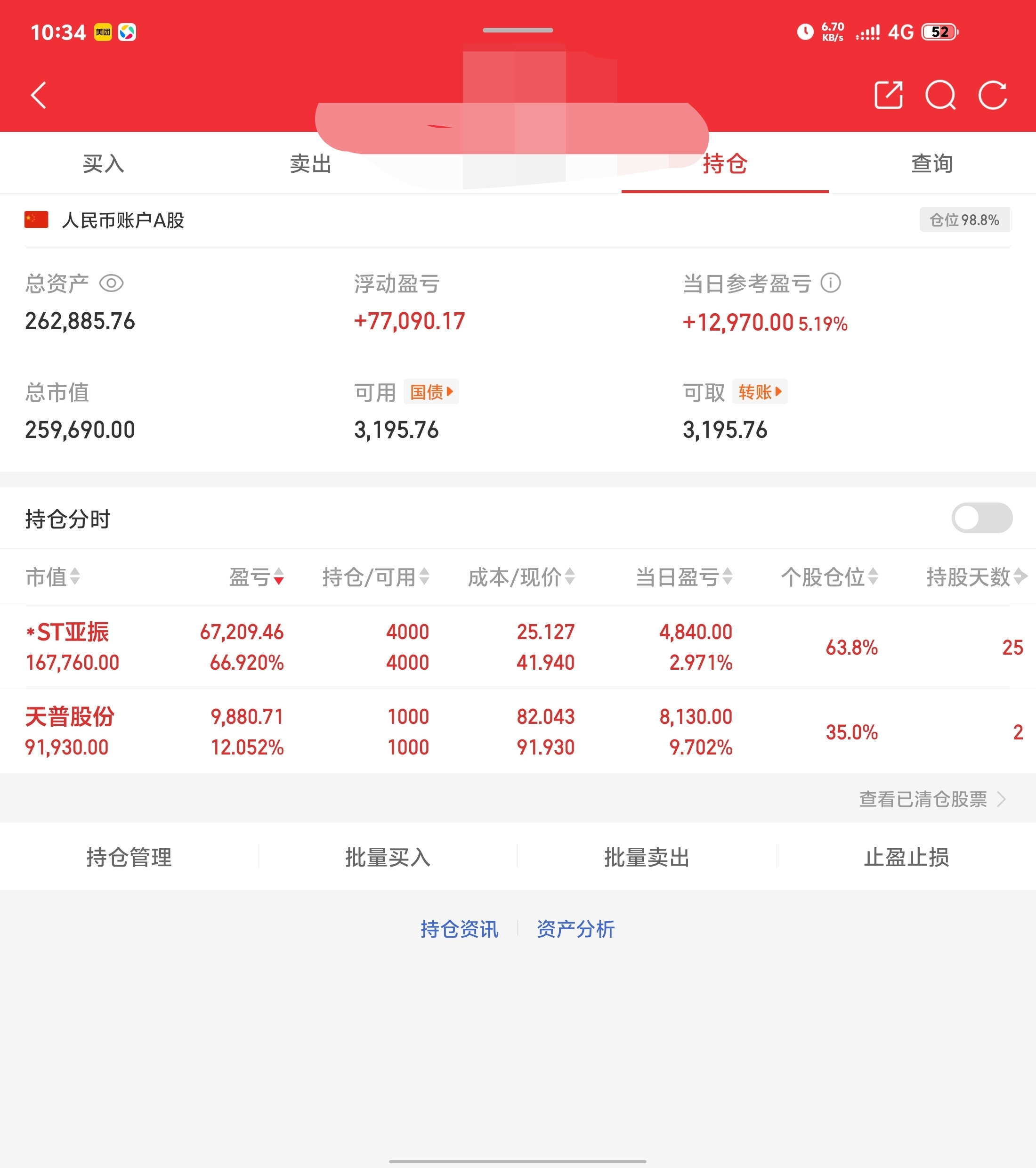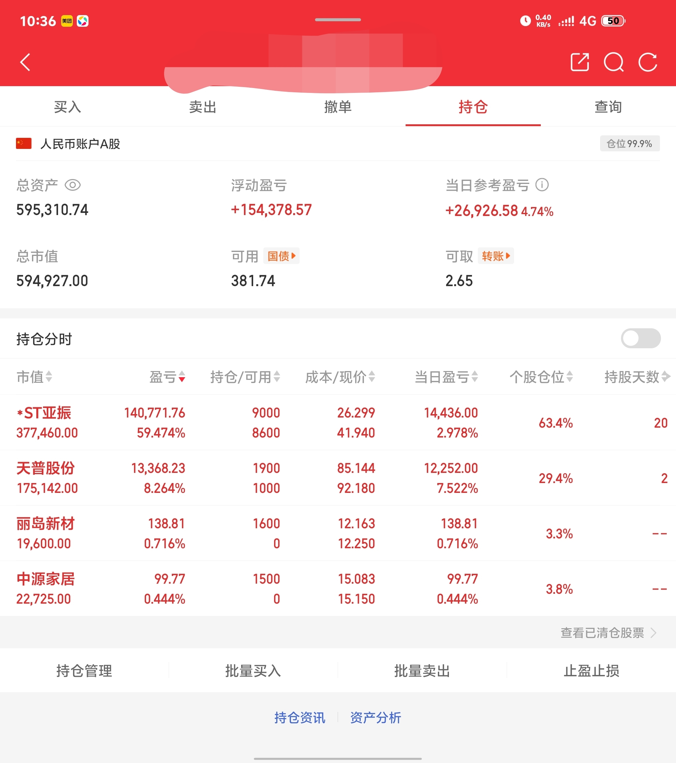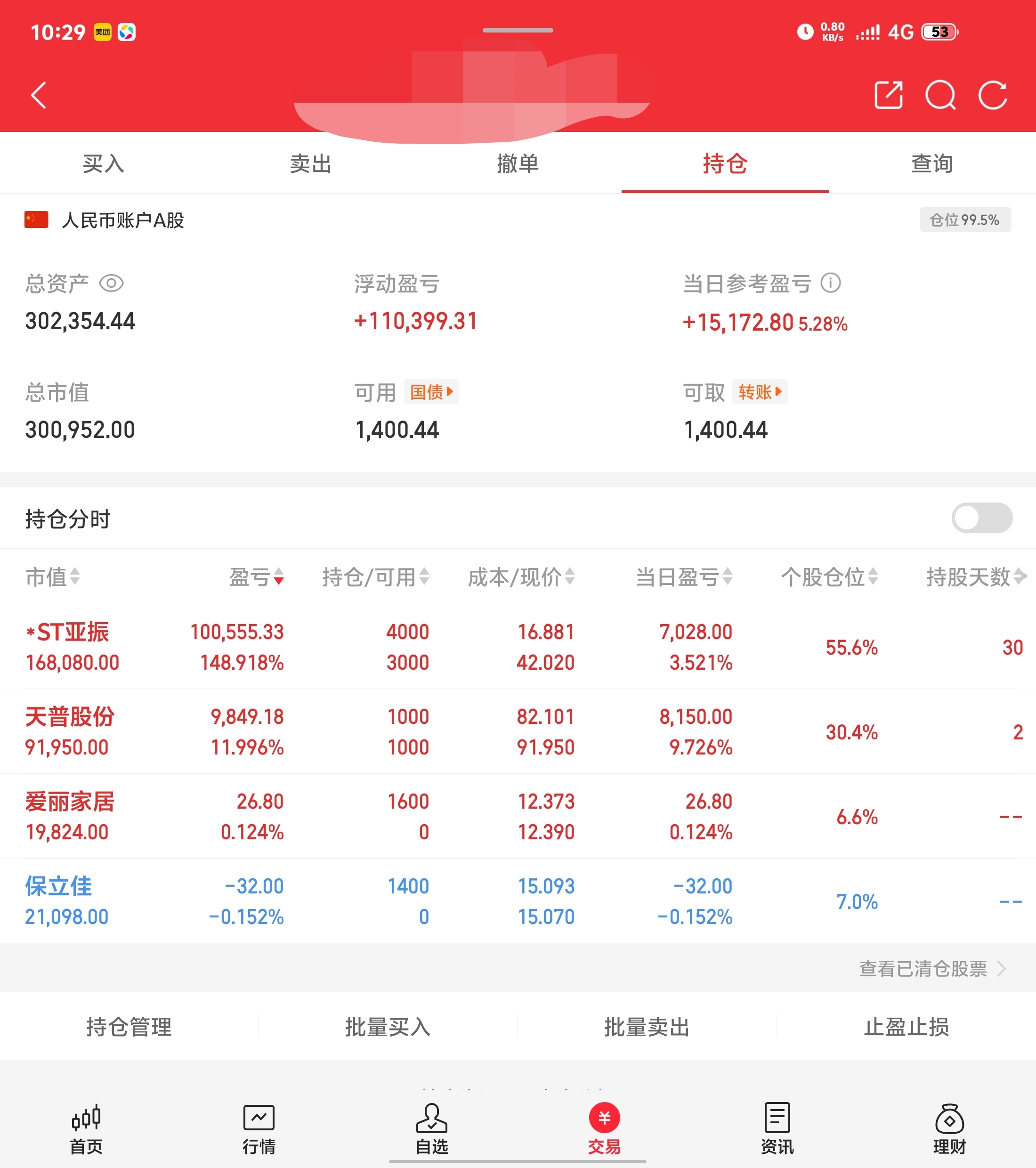 $*ST亚振(SH603389)$ 今天又减仓两个跌停补的二成仓位亚振,继续保持亚振五成最低基本仓位!补仓天普成功封涨停,撒网爱丽中源保立佳丽岛金迪克五只,天普和上纬为二、三重仓股!明天要卖点票还支付宝了,谁涨卖谁。