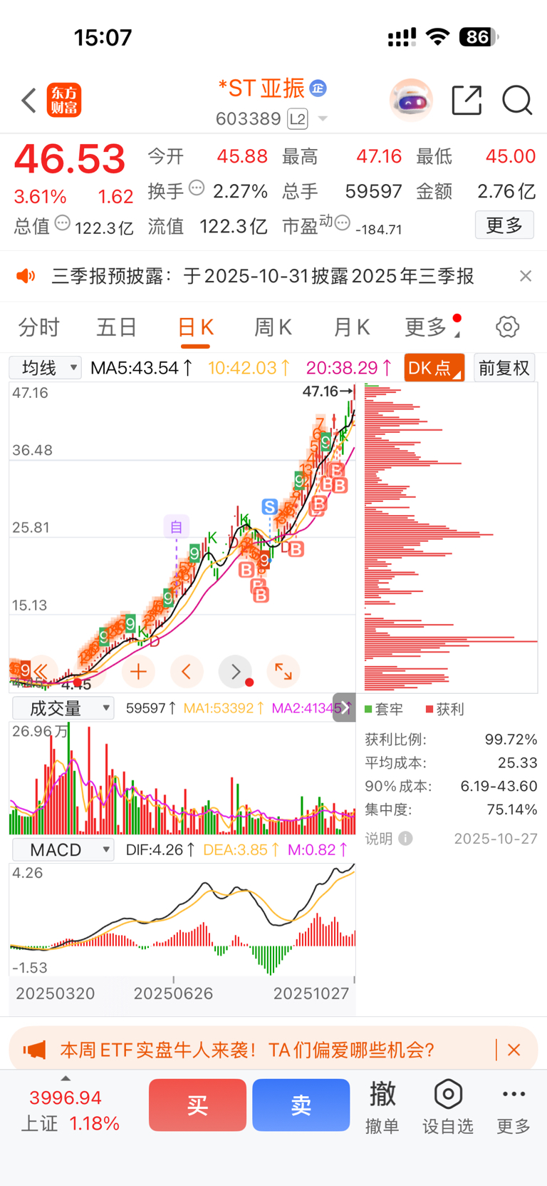 $*ST亚振(SH603389)$ 亚振我就后悔来迟了,因为不咋会做T,现在每天就开盘看一眼,如果水下就加,水上就没管了,跟紧各位大佬吃肉