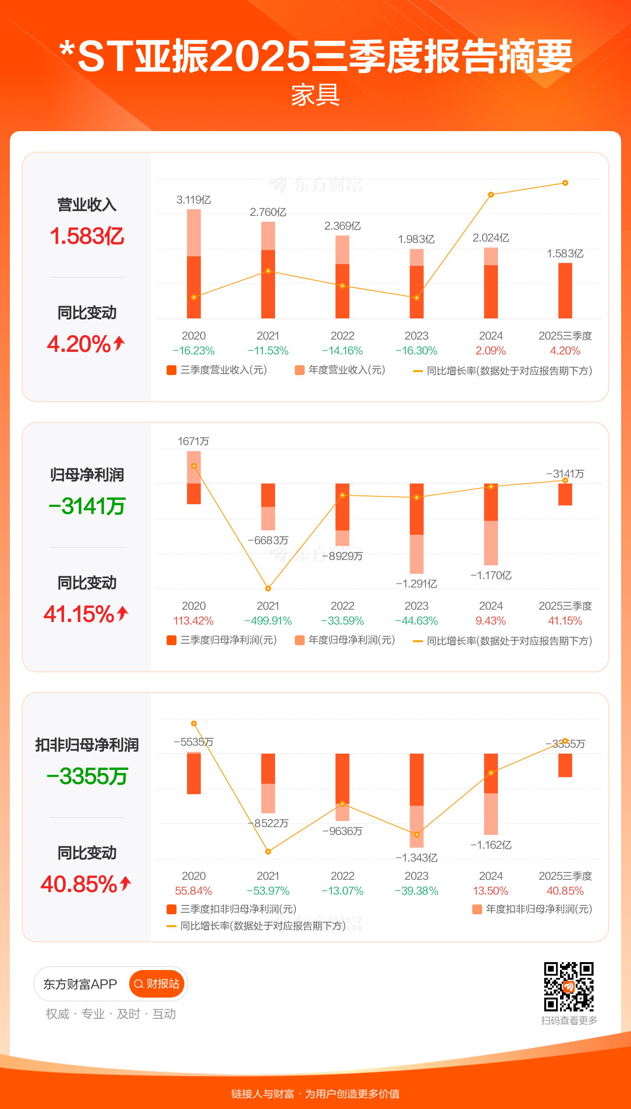 *ST亚振10月31日发布2025年三季报显示,公司前三季实现营业收入1.58亿元,同比增长4.20%;归母净利润-3141.23万元;扣非归母净利润-3355.48万元。