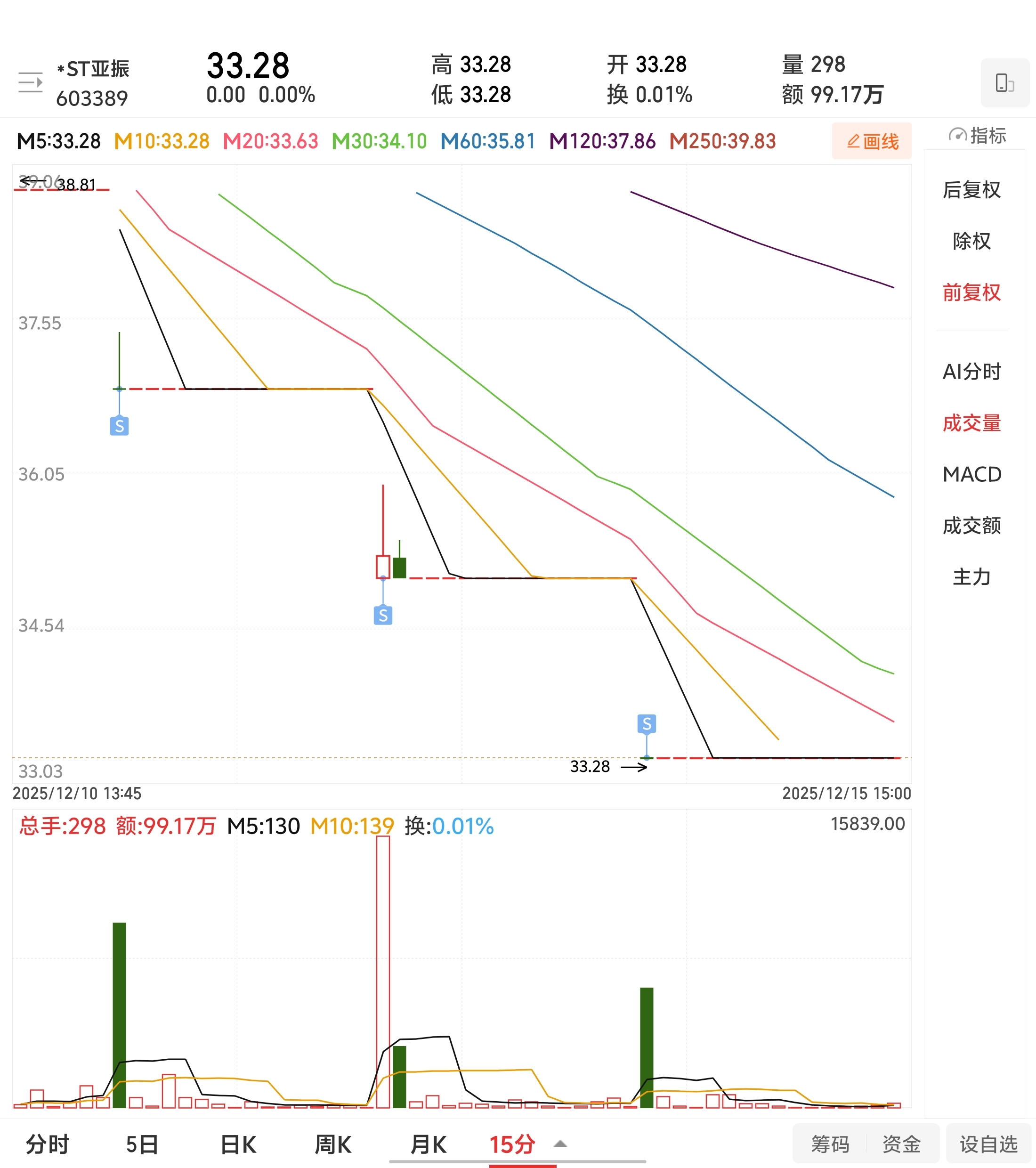 $*ST亚振(SH603389)$ 真想卖出去的很容易吧,已挂单了,基本每天早上9点30前就成交了。每天剁肉反正剁的是利润不心疼,看看宇顺、菲林格尔等都是一个鸟样,这ST指数还要跌几百点!