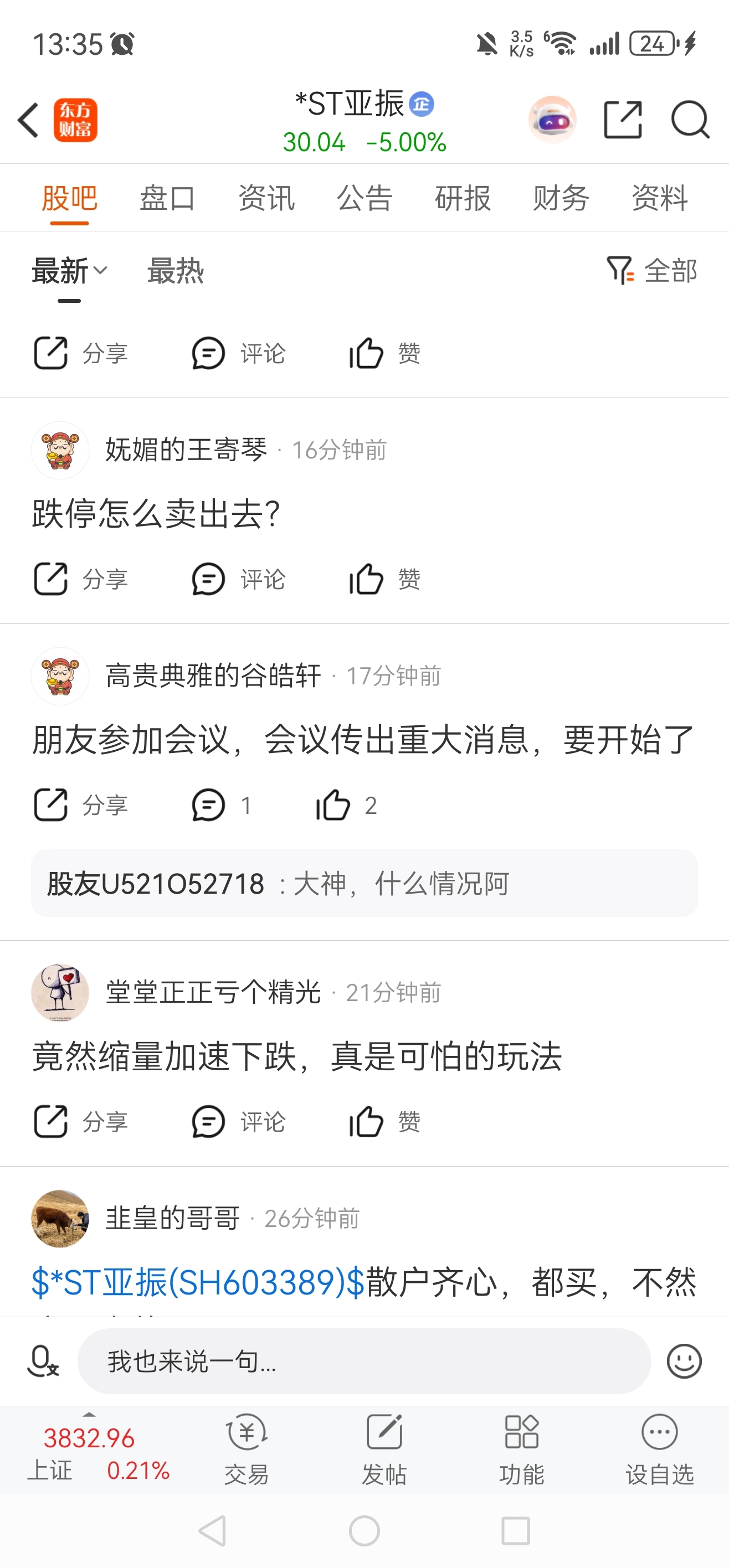 $*ST亚振(SH603389)$ 刚发几个q里的人看就给我拉涨停了