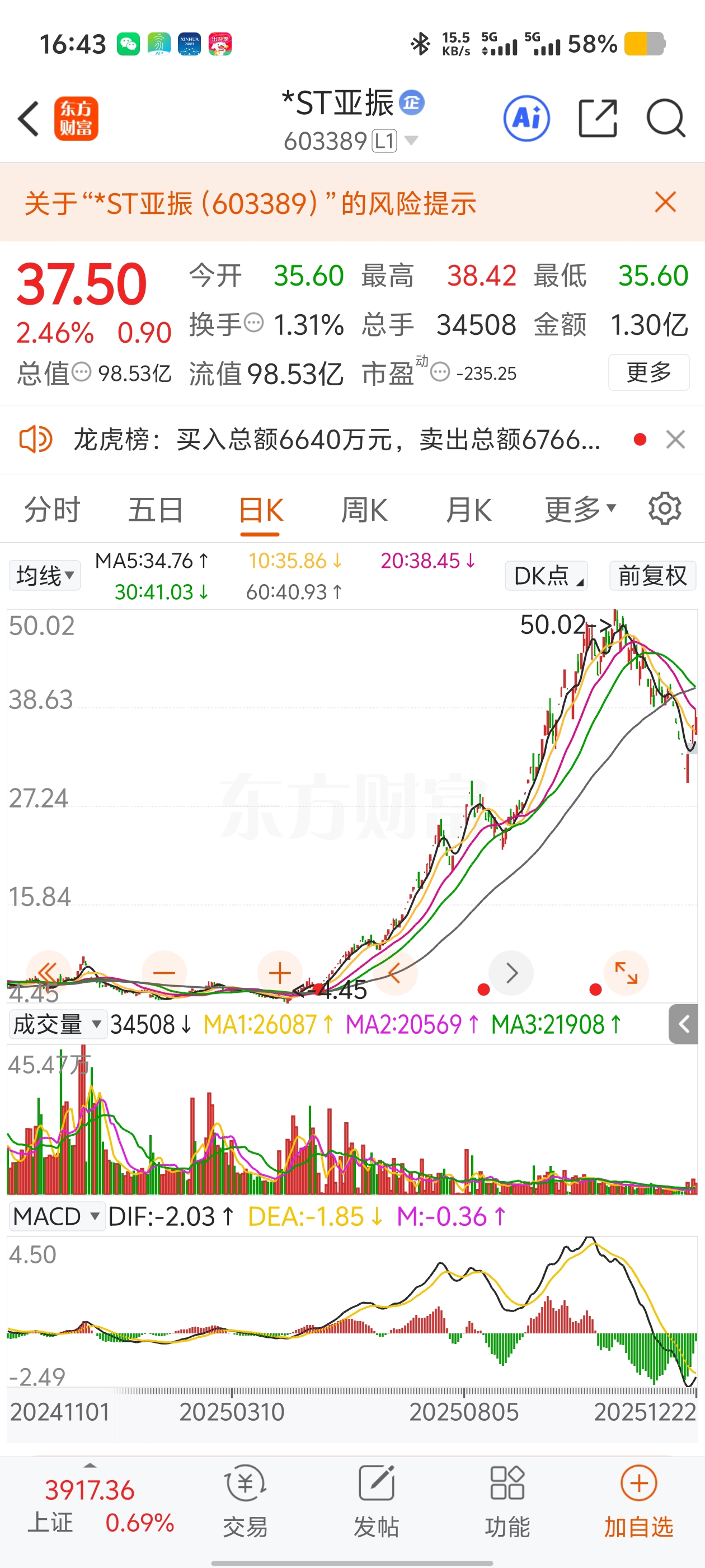$*ST亚振(SH603389)$ 强势股 30 日线回踩,继续反弹继续向上,跌破 60 日不能快速回弹,估计也很难了