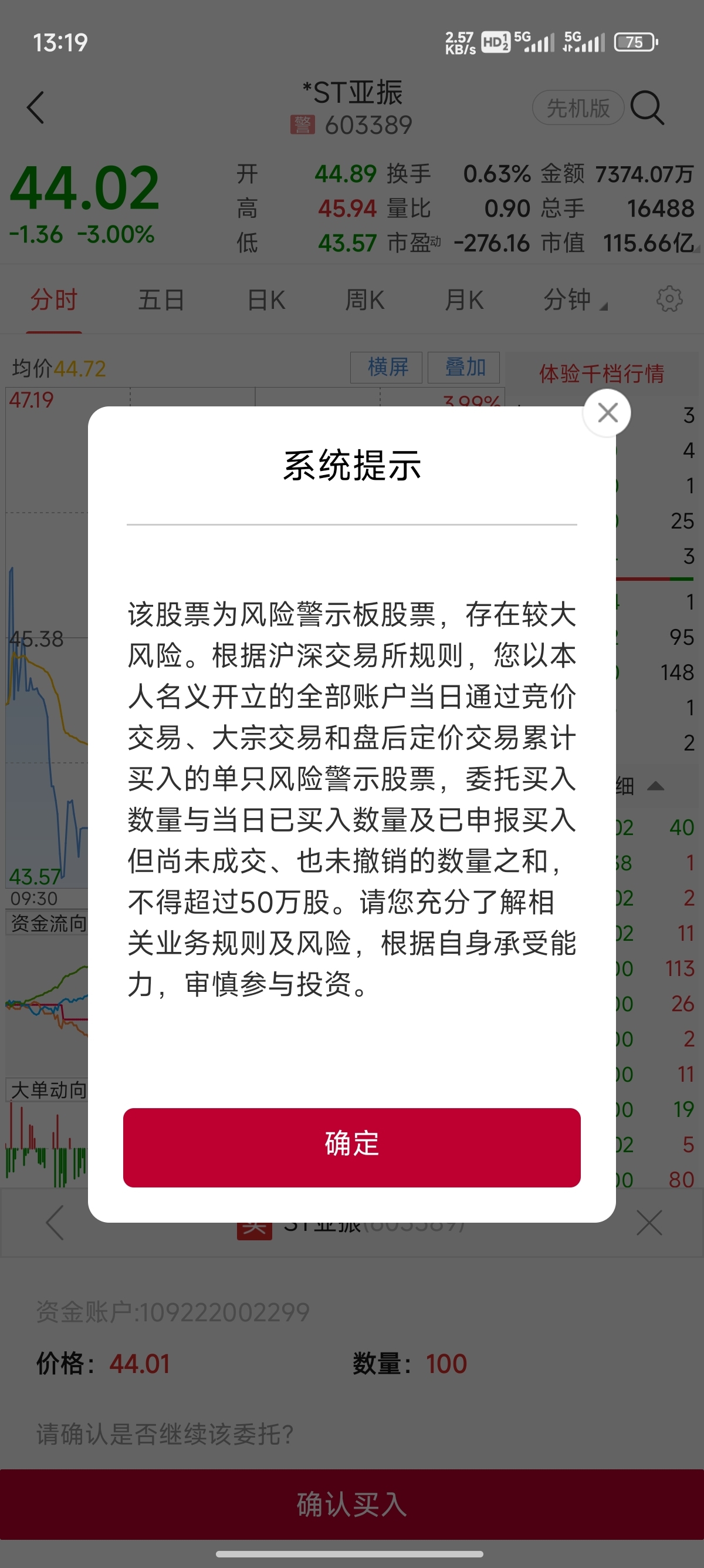 $*ST亚振(SH603389)$ 我就100股啊,44楞了一下就没了