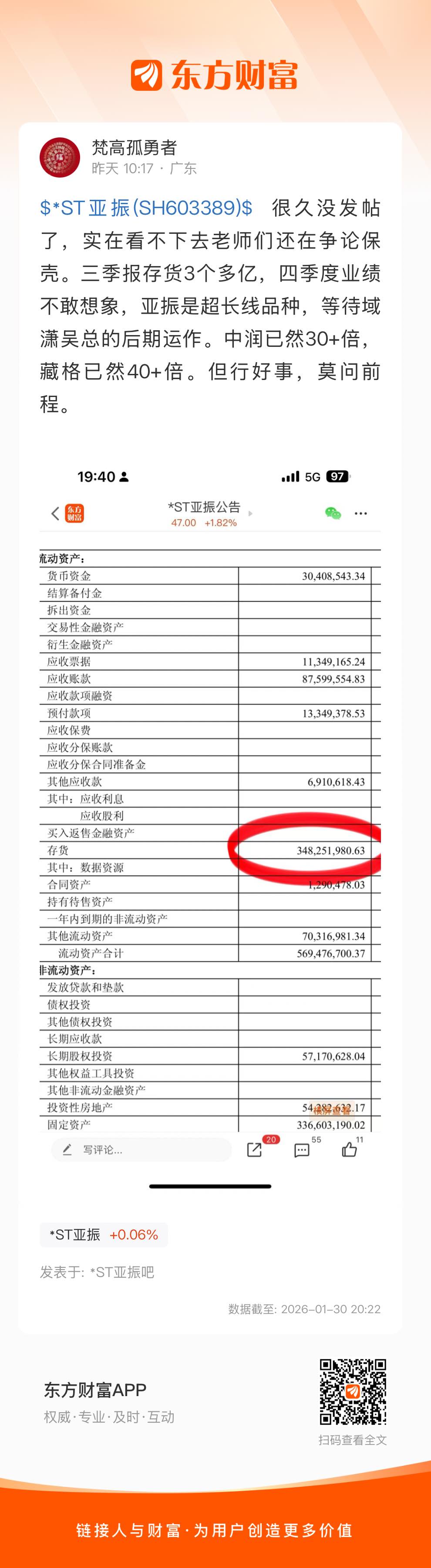 $*ST亚振(SH603389)$ 很久没发帖了,实在看不下去老师们还在争论保壳。三季报存货3个多亿,四季度业绩不敢想象,亚振是超长线品种,等待域潇吴总的后期运作。中润已然30+倍,藏格已然40+倍。但行好事,莫问前程。